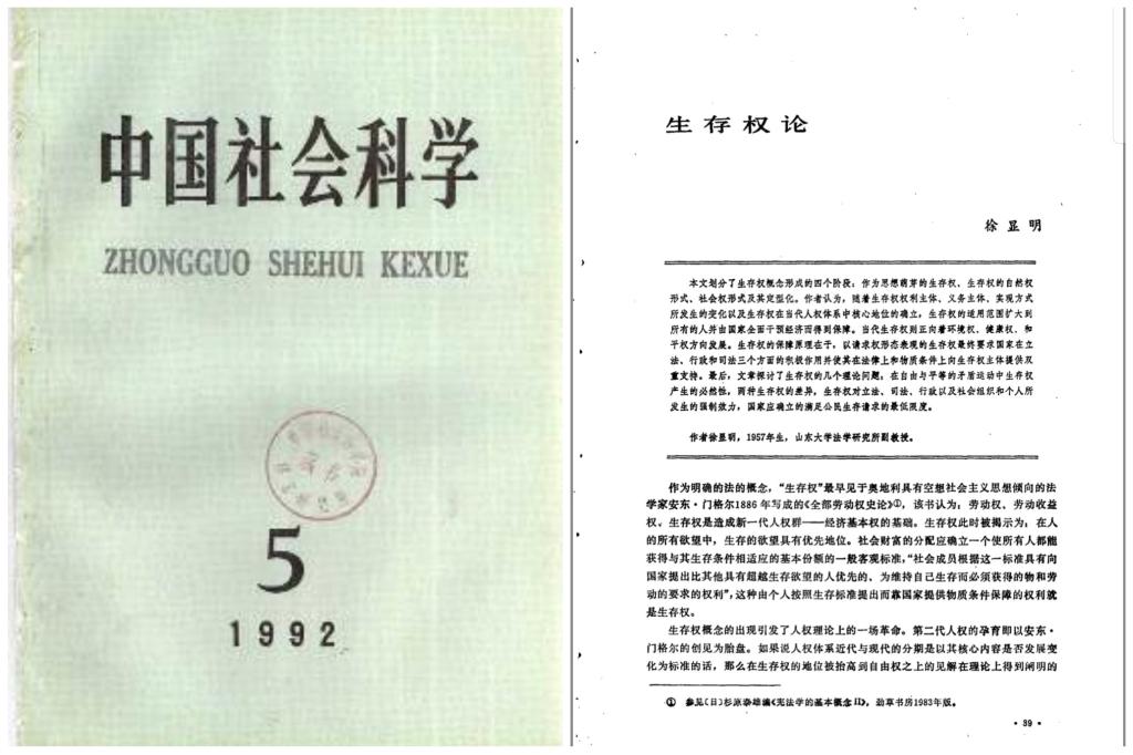 1992年9月,徐显明在《中国社会科学》第5期发表《生存权论》。文章一经刊登,便在国内外产生了巨大影响,“在理论上开辟了法学研究的新领域;在实践上成为中国人权外交和人权白皮书的理论根据,为中国社会保障制度的重构作了理论准备;在学术史上则标志着中国法学从幼稚走向成熟”。