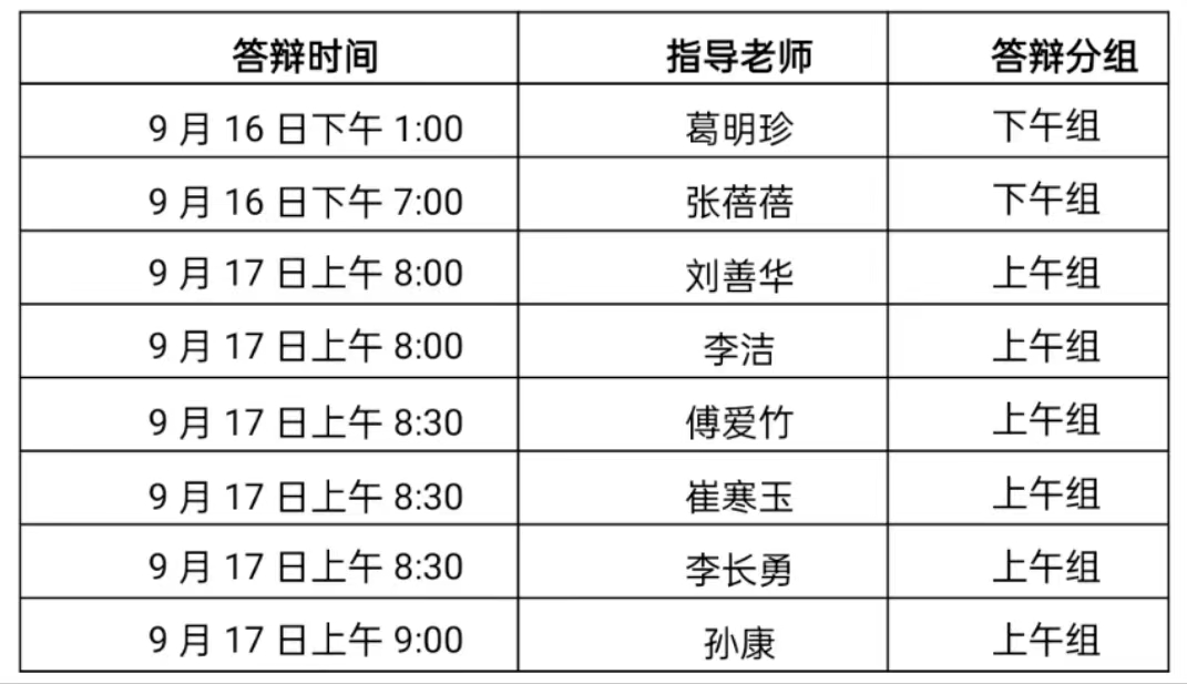 三、答辩组及答辩人数不统一,我们只统一答辩开始时间,答辩结束时间由答辩组自定。如有变更,以答辩组老师通知为准。