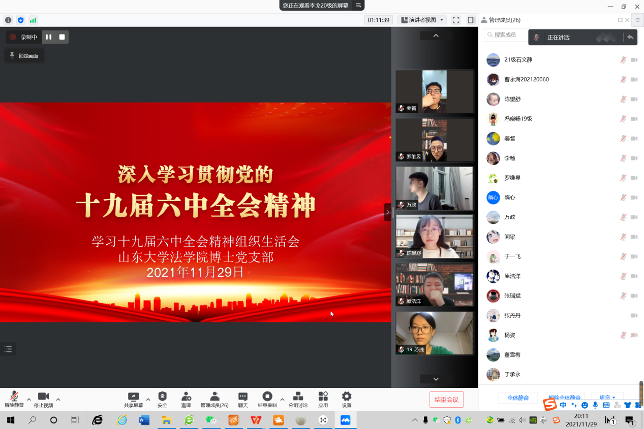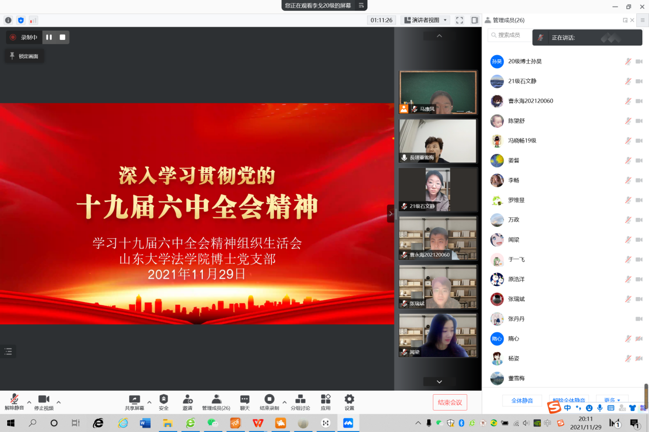 张瑞斌首先领学党的十九届六中全会精神和相关决议内容,并向大家汇报了自己的学习体会。随后部分党员分享了思想认识和学习心得。姜督结合博士研究生自身特点谈了自己对《中共中央关于党的百年奋斗重大成就和历史经验的决议》的认识和体会;曹永海从马克思主义中国化的发展历程谈了对马克思理论创新发展的认识;孙昊从我党百年奋斗史的角度回顾了党的建设取得的成绩;马康凤结合博士研究生的专业特点谈了如何把习近平法治思想与自身学术研究、科研方向结合起来;闻梁从博士研究生的视角谈了如何提高学生党员的政治意识和政治素养。