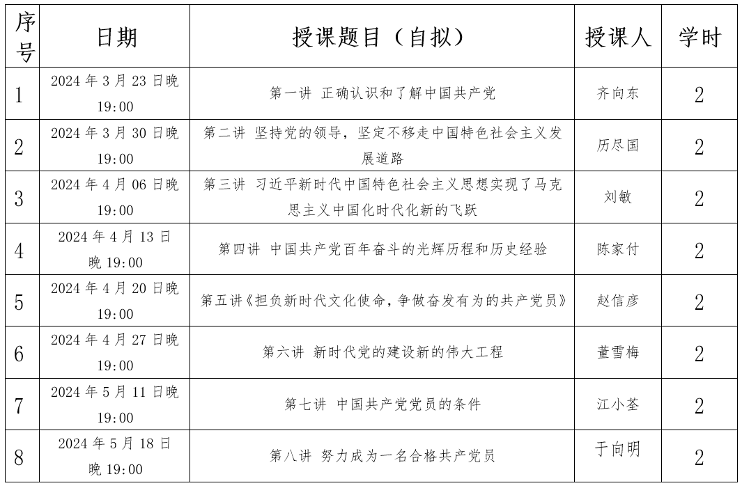 授课教材统一使用中共中央组织部指定的入党积极分子培训用书《入党教材》,党校还将统一制作部分课件供参考使用。分为8个专题,安排学时16学时。