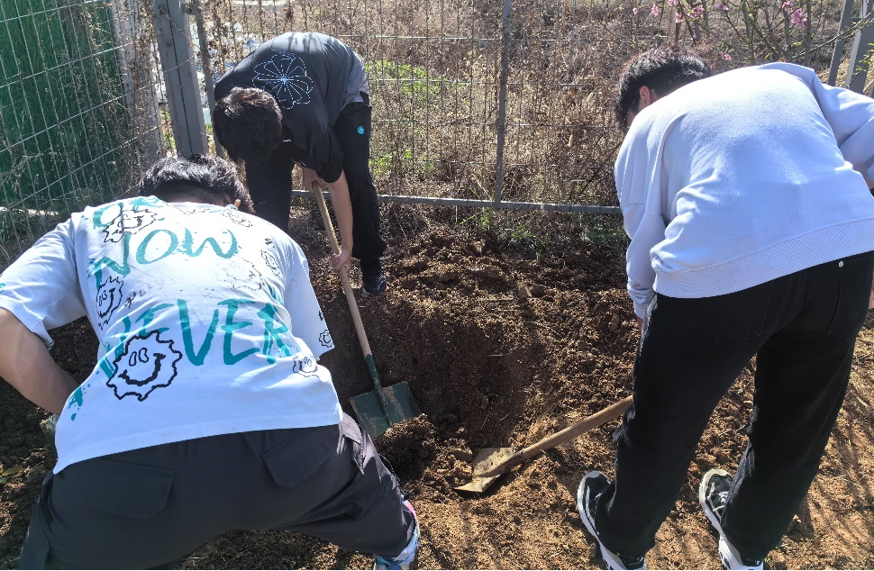 本次活动分为农作物种植和农场装扮两个部分。在农作物种植阶段,同学们拿起锄头、铲子、水桶等工具松土、挖坑、播种、施肥、浇水,忙得不亦乐乎,最终种下月季、蓝莓、绣球、西红柿等作物。在农场装扮阶段,同学们拿上画笔和颜料制作植物挂牌并以井盖为“画纸”进行涂鸦创作,让农场的面貌焕然一新。