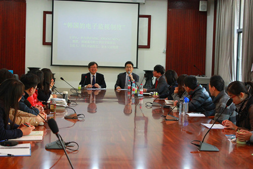 下午两点,朴光玟教授以“韩国的电子监视制度”为题在我院做学术报告,金永完副教授主持报告。朴光玟教授从电子监视制度的意义、引进原因及变迁、法律特征、主要内容、执行机关和方法、法律论焦点等方面系统介绍了韩国的电子监视制度。我院学生就电子监视制度的成本效益问题、人权隐私保护措施、制裁方式等向朴光玟教授进行提问。