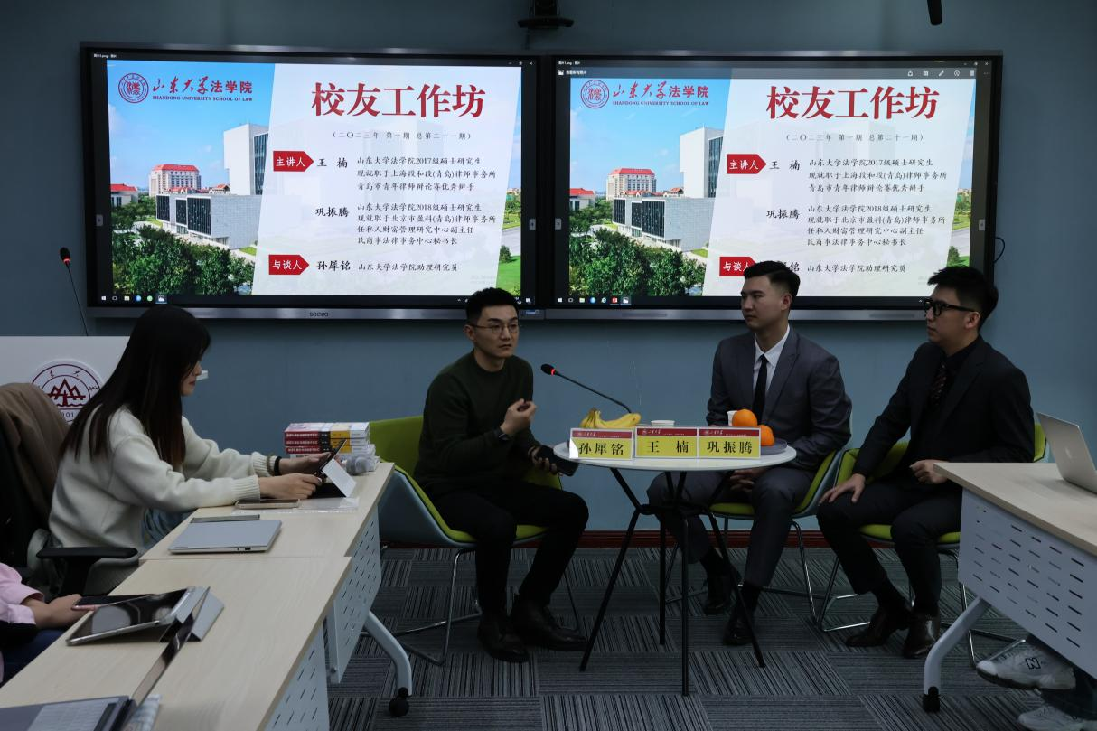 2月27日,金沙集团1862cc成色校友工作坊在华岗苑举办。活动邀请到2017级硕士研究生、上海段和段(青岛)律师事务所律师王楠校友和2018级硕士研究生、北京市盈科(青岛)律师事务所律师巩振腾校友,以“青年律师的执业之路”为主题分享个人的职业选择与规划,并给予就业指导建议。金沙集团1862cc成色助理研究员孙犀铭作为与谈人参与了此次活动。