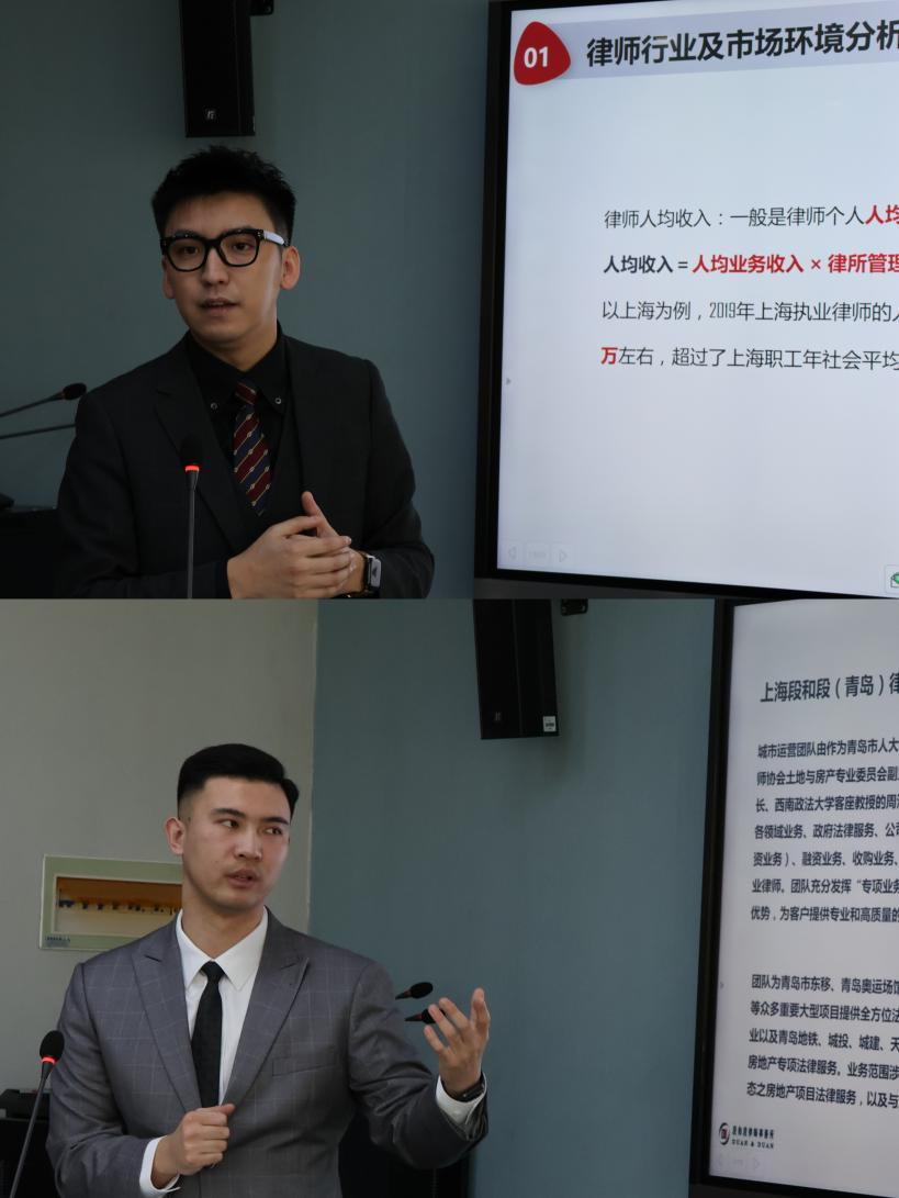 王楠在介绍了自己所在团队的情况后,就法学生的职业选择、青岛实习律师的现状进行了分享。他介绍道,律所分为提成制律所和公司制律所,二者的主要区别在于业务收入和分配方式,且入所后的发展路径不同。关于实习律师与独立律师,王楠认为独立律师需要有更强的自驱力、执行力和责任心,要从团队的客户中锻炼出业务能力,重视工作中的反馈和复盘。