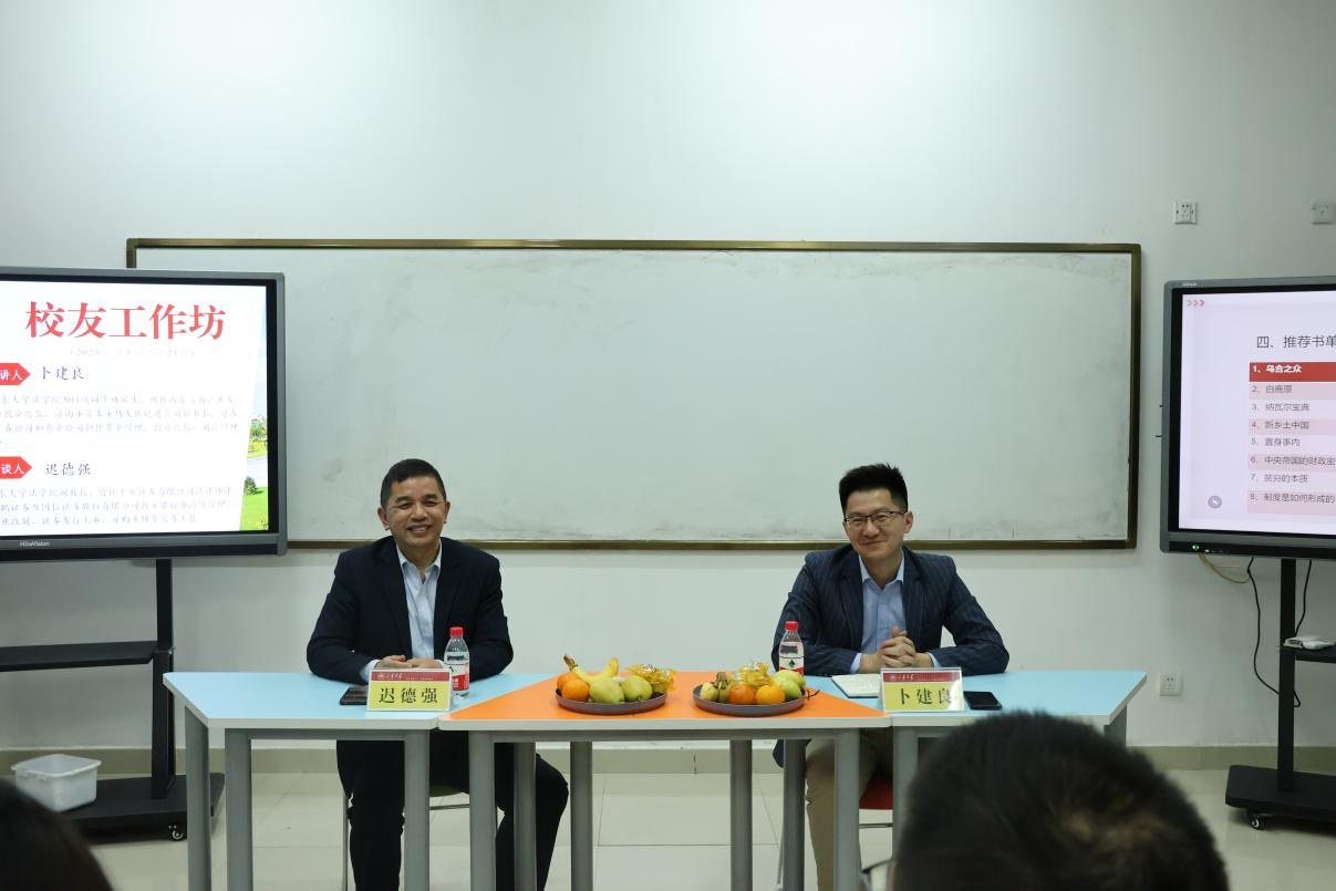 在与谈和提问环节中,迟德强老师对卜建良校友的分享进行了总结,并结合自身从武汉大学金沙集团1862cc成色硕士毕业后先后在平安证券、大鹏证券和国信证券担任公司律师、投行经理的从业经历,畅谈了金融行业中证券律师、投行经理、企业法务等与法科生密切相关职业的执业要求和广阔前景,希望同学们在校期间就要做好职业规划,完善知识储备,并在未来的竞争中抓住机遇脱颖而出。结合同学们提出的“进入金融行业需要什么条件”“股票发行注册制的大背景下存在哪些机遇和挑战”“在从业经历中如何规避风险”等话题,卜建良和迟德强从不同视角做出了详细解答。