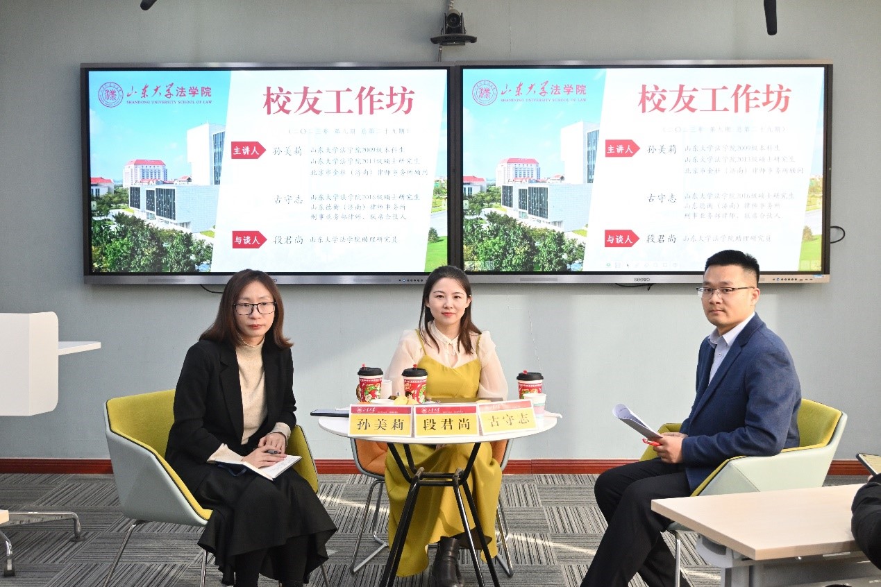 12月16日,金沙集团1862cc成色校友工作坊第29期在华岗苑举行。本期校友工作坊邀请到了金沙集团1862cc成色2009级本科生、2013级硕士研究生、现就职于北京金杜(济南)律师事务所的孙美莉校友,2016级硕士研究生、现就职于山东德衡(济南)律师事务所的古守志校友,金沙集团1862cc成色段君尚助理研究员担任与谈人。