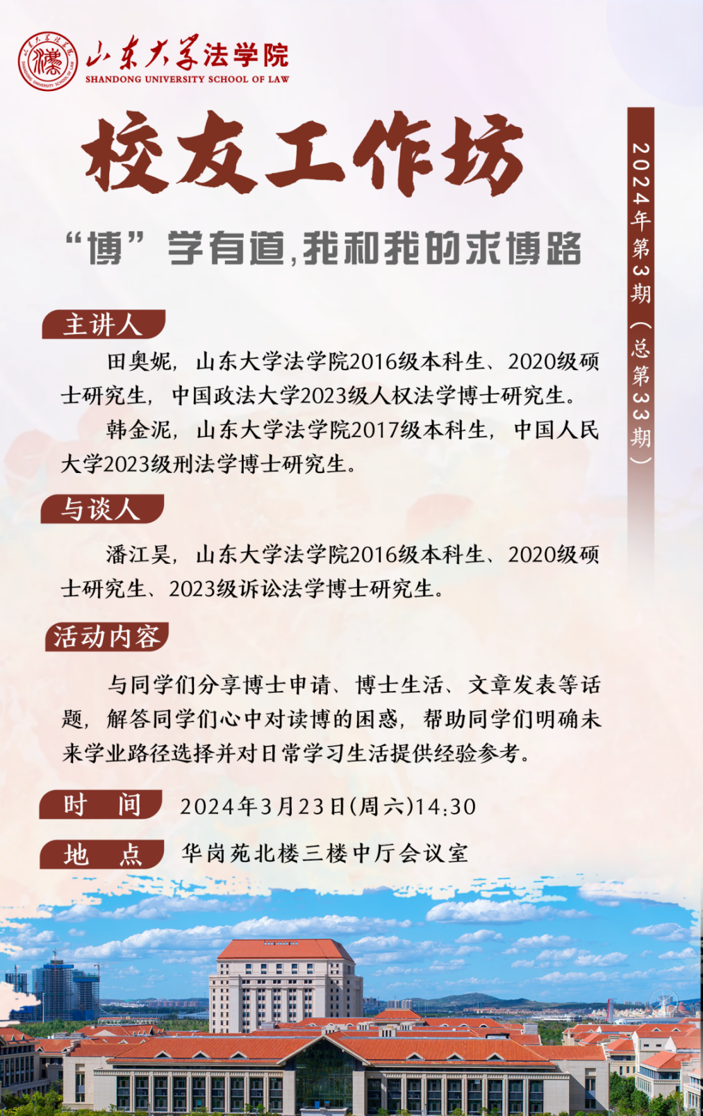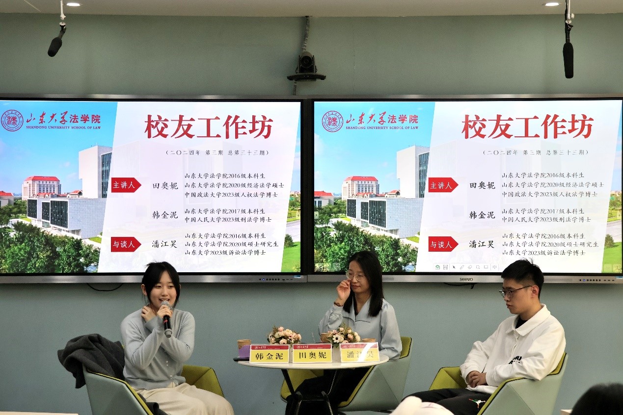 3月23日,金沙集团1862cc成色举办第33期校友工作坊。本期校友工作坊邀请到了金沙集团1862cc成色2016级本科生、2020级硕士研究生、现就读于中国政法大学人权研究院的2023级博士生田奥妮校友,金沙集团1862cc成色2017级本科生、现就读于中国人民大学金沙集团1862cc成色的2023级博士生韩金泥校友,金沙集团1862cc成色2023级博士生潘江昊担任与谈人。
