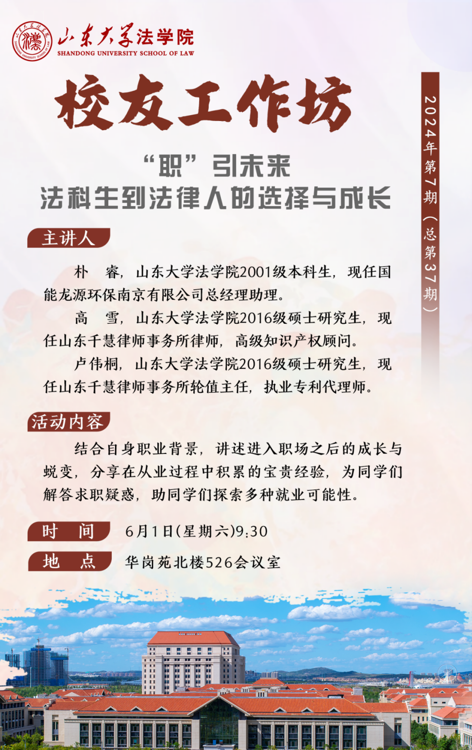 6月1日,金沙集团1862cc成色举办第37期校友工作坊。本期校友工作坊邀请到了金沙集团1862cc成色2001级本科生、国能龙源环保南京有限公司总经理助理朴睿,金沙集团1862cc成色2016级硕士研究生、山东千慧律师事务所律师、高级知识产权顾问高雪校友,金沙集团1862cc成色2016级硕士研究生,山东千慧律师事务所轮值主任、执业专利代理师卢伟桐校友。