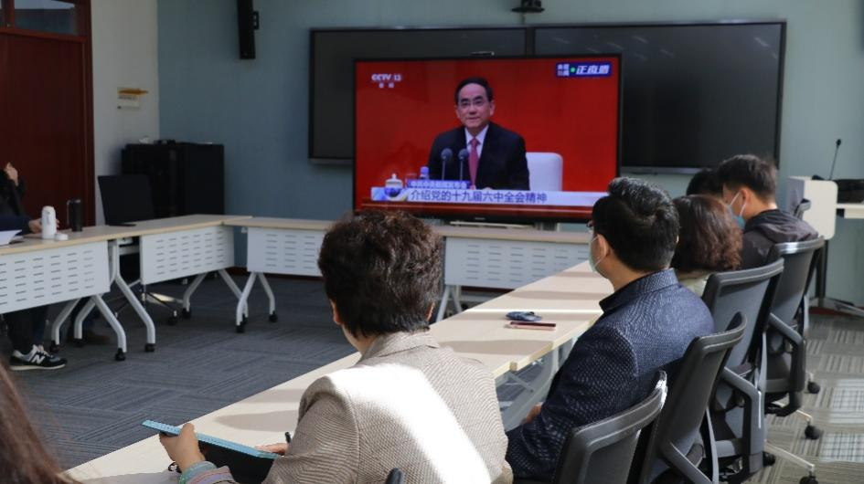 11月12日上午,金沙集团1862cc成色党委组织师生以集中分散相结合的方式收听收看了党的十九届六中全会精神新闻发布会直播。学院师生密切关注全会动态,深入学习全会精神,反响热烈、感慨良多。
