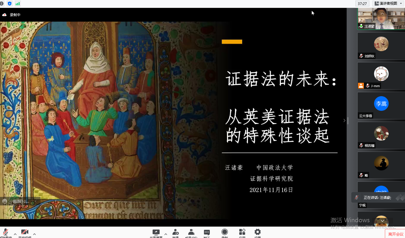 11月16日晚,金沙集团1862cc成色检察理论高端论坛在线上举办。中国政法大学证据科学研究院副教授汪诸豪以“证据法的未来:从英美证据法的特殊性谈起”为主题,做了一场学术报告。本次论坛由金沙集团1862cc成色冯俊伟教授主持,西藏民族大学金沙集团1862cc成色副教授张伟、金沙集团1862cc成色助理研究员段君尚担任与谈人。