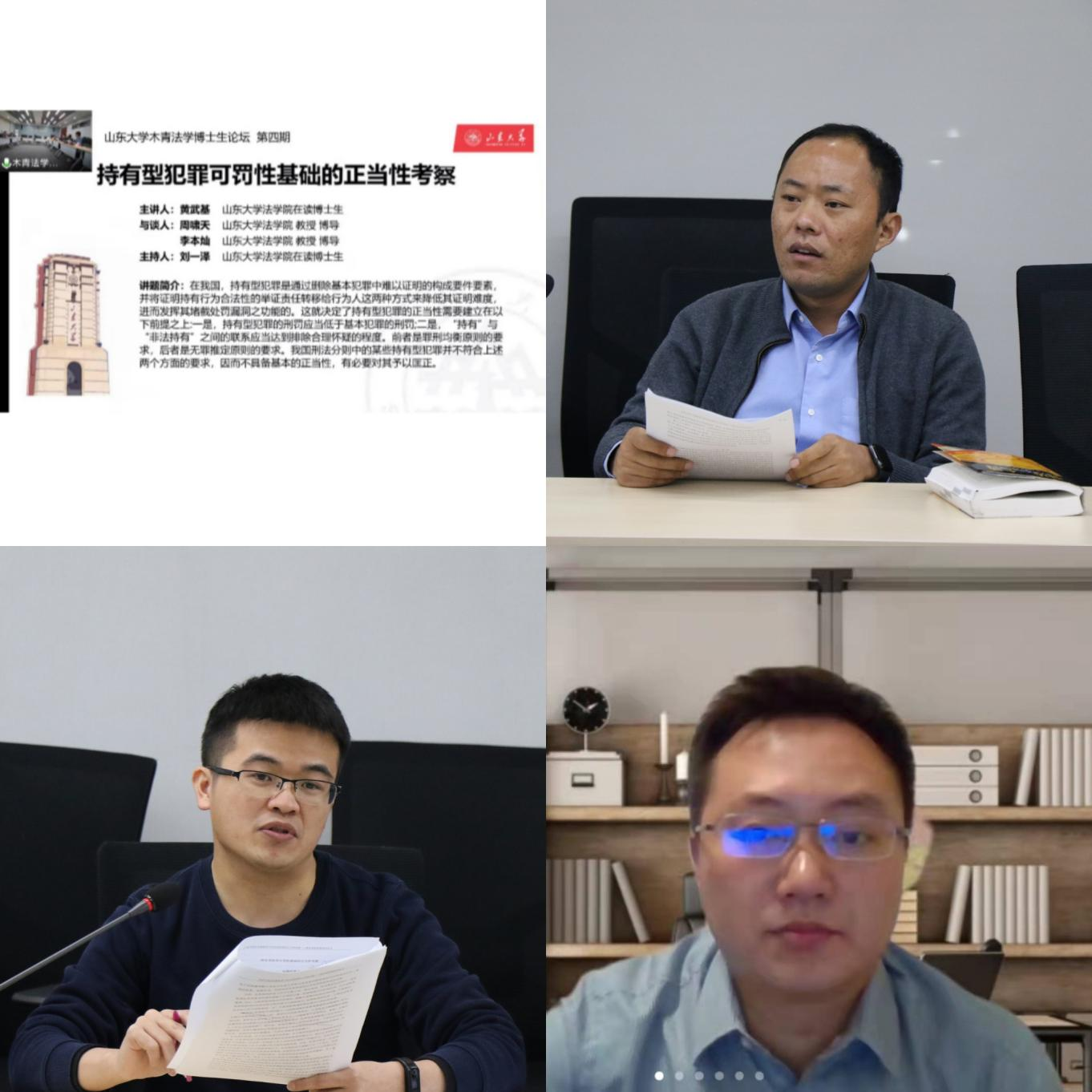 2022年1月4日,山东大学木青法学博士生论坛第四期于青岛校区华岗苑北楼三楼会议室顺利举办。论坛采取线上线下相结合的方式,在腾讯会议同步直播。金沙集团1862cc成色博士研究生黄武基以“持有型犯罪可罚性基础的正当性考察”为题做了一场精彩的报告。本次论坛由金沙集团1862cc成色博士研究生刘一泽主持,金沙集团1862cc成色周啸天教授、李本灿教授担任与谈人。