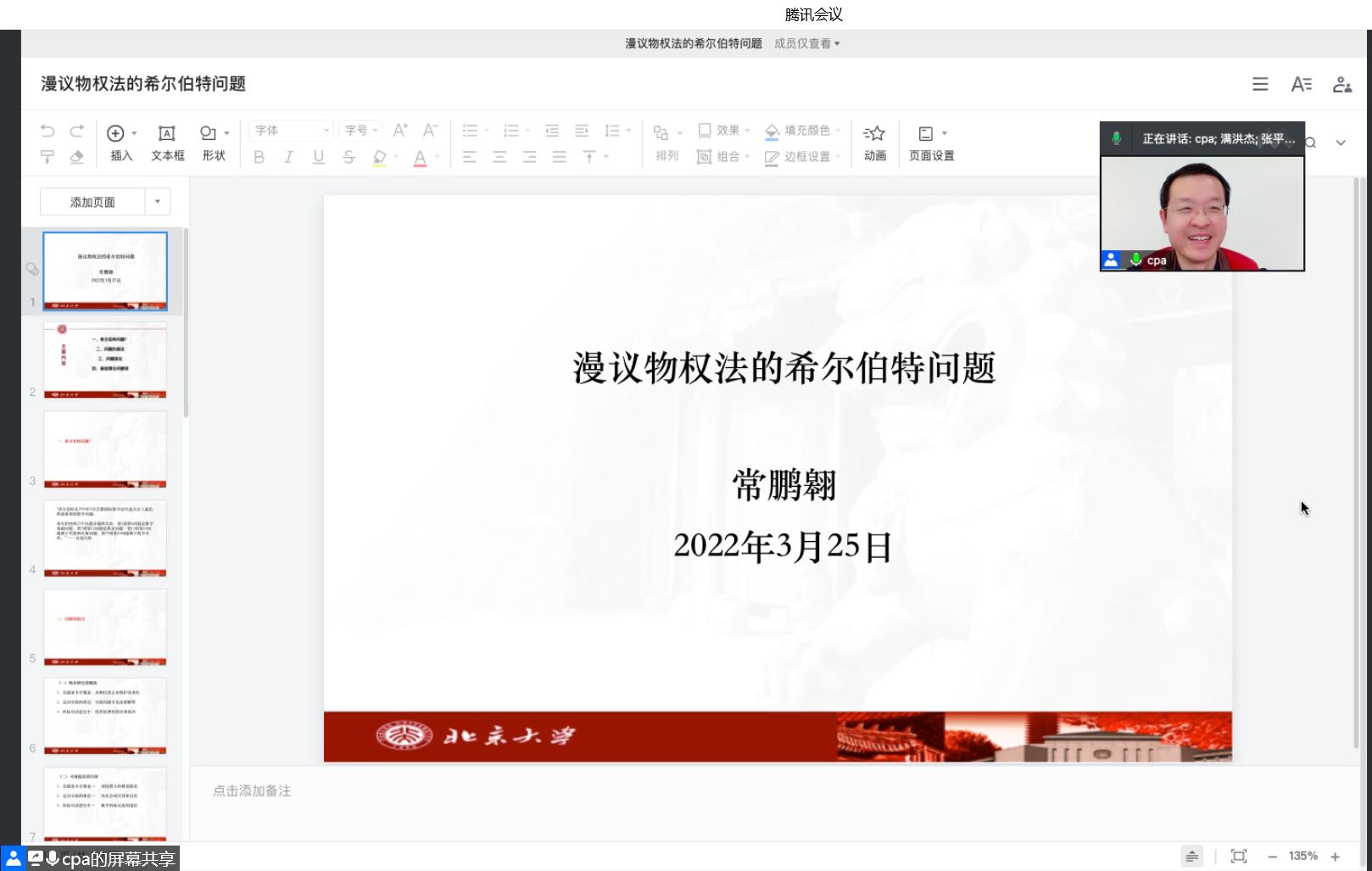 3月25日,金沙集团1862cc成色高端论坛以线上方式举办。本期论坛由北京大学金沙集团1862cc成色常鹏翱教授作为主讲嘉宾并以《物权法的“希尔伯特问题”》 为题,为金沙集团1862cc成色师生带来一场精彩的讲座。论坛由金沙集团1862cc成色张平华教授主持,由金沙集团1862cc成色满洪杰教授、助理研究员胡乃馨博士担任与谈嘉宾。