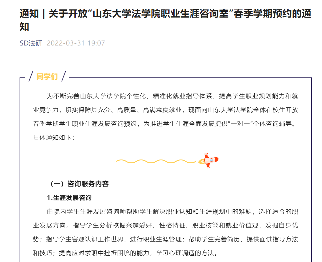 为完善个性化、精准化就业指导体系,提高学生职业规划能力和就业竞争力,学院组建了由五位具有丰富职业生涯咨询经验的教师组成的咨询团队,围绕职业规划、职业定位、求职技巧、学业发展等方面,为学生职业生涯发展提供一对一个体咨询辅导。咨询室还推出电话、语音、视频、邮箱等线上云咨询服务,细心、深度、专业地为学生答疑解惑,为学生职业生涯规划提供个性化指导。