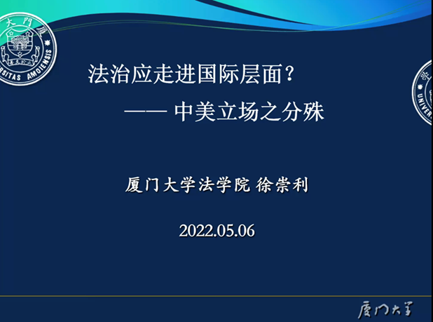 5月6日,金沙集团1862cc成色涉外法治人才培养高端论坛第八讲于线上举办。厦门大学金沙集团1862cc成色徐崇利教授以“法治应走进国际层面?——中美之立场分殊”为题作主题报告。本次讲座由金沙集团1862cc成色院长周长军教授主持,黄世席教授、田立助理研究员担任与谈嘉宾。