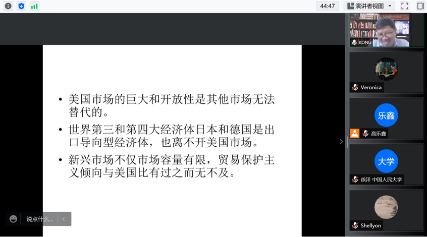 首先,孔庆江教授以二战后的美国为例,批判性地分析了国际经贸规则制定中话语权的主导机制。“实力说”认为美国对国际贸易规则的主导是其军事霸权在贸易领域的延伸,但无法解释二战前美国军事实力与话语权不相符的情形;“能力说”认为美国能具有主导地位是因为其熟谙规则制定过程如议程设置,但无法解释同样深谙规则的英国话语权不强的问题。针对此,孔庆江教授创新性地提出“市场依赖说”,认为美国对贸易规则的主导地位源于其开放的市场及他国出口对美国市场的依赖。其次,孔庆江教授客观地指出了当下中国在世贸组织规则制定的话语权与其在国际贸易与经济格局中的地位不相称的问题。再次,孔庆江教授从历史惯性、市场依赖度、具体议题设置能力、工作重点偏移、西方国家的污名化五个角度分析不相称的原因。最后,孔庆江教授提出了扩大话语权的六点具体建议:进一步开放市场、提高国际转换意识和能力、提高设置议题的能力、增加在世贸组织的代表性、加强与其他国家在世贸组织中的合作、提升中国国际形象。
