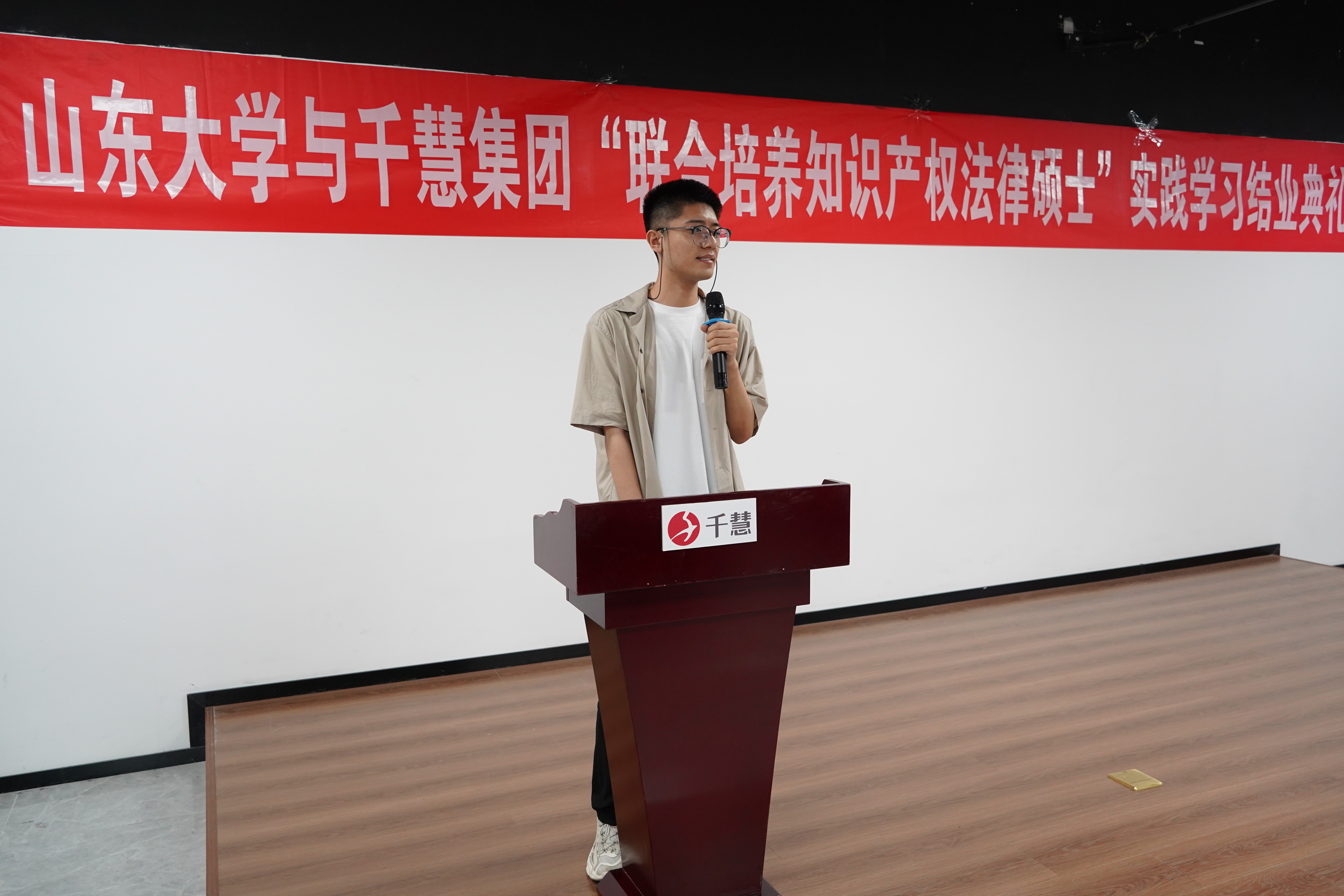 千慧集团高级知识产权顾问、金沙集团1862cc成色校友高雪代表全体实务老师总结了实习生的实习情况,她表示“山大与千慧是双向奔赴,相互契合,相互成就”,对同学们的工作状态做出高度评价。2020级知识产权特色班研究生杨荣杰代表全体参加实践学习的同学做了实习工作总结,对千慧集团在培训中细心安排校友前辈为大家答疑解惑、助消迷惘表达感谢。