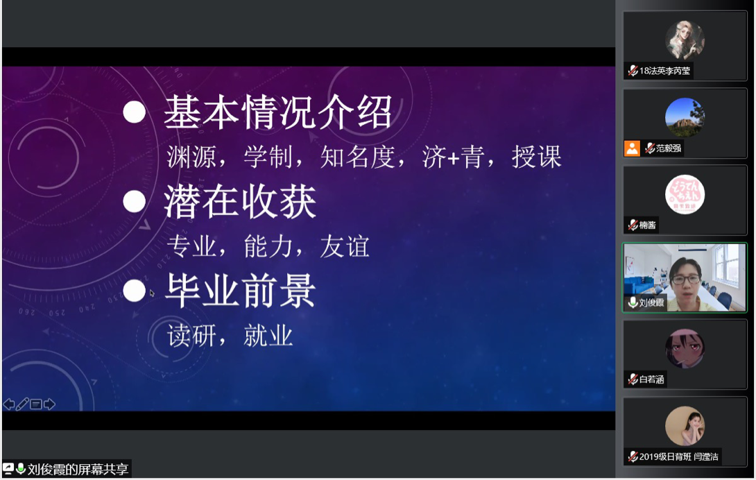 此外,阎滢洁同学结合自身学习经验,分享了日语学习对于个人发展积极影响,白若涵同学结合在广岛大学交流学习经历指出,班级的前置教学为后续交换生活提供了较大便利。李芮莹同学提到,特色班能够锻炼学习能力,体验更丰富校园生活,建立深厚班级友谊。