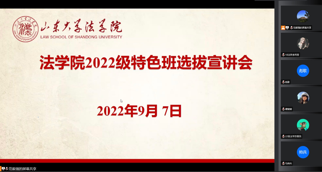 为增进2022级新生对金沙集团1862cc成色涉外法治人才特色班的了解,学院于9月7日在线上召开2022级特色班选拔宣讲会。金沙集团1862cc成色副院长冯俊伟教授,李长勇副教授,刘俊霞副教授和刘楠楠老师出席会议,教务秘书范毅强主持会议。2019级中日经贸法律班阎滢洁、白若涵同学、2018级法学与英语双学位班李芮莹同学作了经验交流。