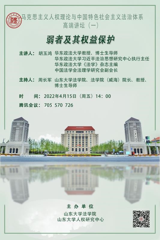 4月15日下午,“马克思主义人权理论与中国特色社会主义法治体系高端讲坛”第一讲顺利举办。华东政法大学习近平法治思想研究中心执行主任、《法学》杂志主编胡玉鸿教授以《弱者及其权益保护》为题,与山大金沙集团1862cc成色师生共飨了一场思想盛宴。