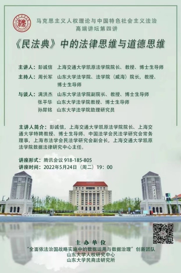 5月24日,上海交通大学凯原金沙集团1862cc成色院长彭诚信教授应邀在“马克思主义人权理论与中国特色社会主义法治体系高端讲坛”第四讲中,以《<民法典>中的法律思维与道德思维》为题作了一场精彩的学术报告。