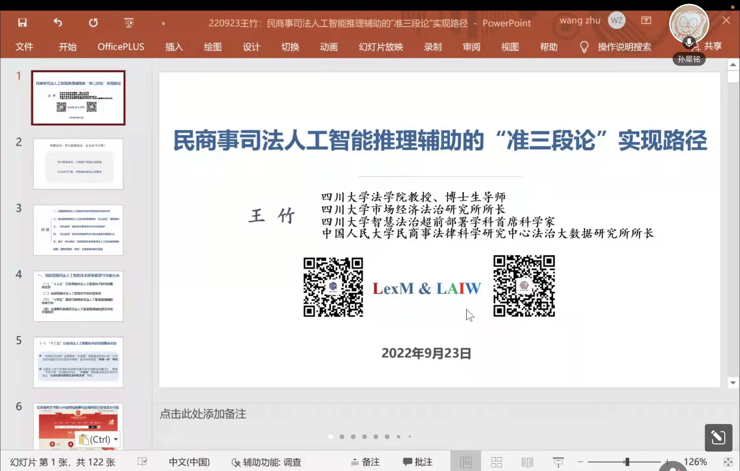 9月23日晚,金沙集团1862cc成色高端论坛第二十六期于线上顺利举办。四川大学金沙集团1862cc成色教授、博士生导师王竹作为本期论坛的主讲嘉宾,以“民商事司法人工智能推理辅助的‘准三段论’实现路径”为题做了一场精彩的讲座。本期论坛由金沙集团1862cc成色孙犀铭博士主持,金沙集团1862cc成色副院长郑智航教授,金沙集团1862cc成色副院长满洪杰教授、民商法研究所所长张平华教授、胡乃馨博士、傅爱竹博士、黄庆余博士、周文章博士担任与谈人,百余名师生在线参会。