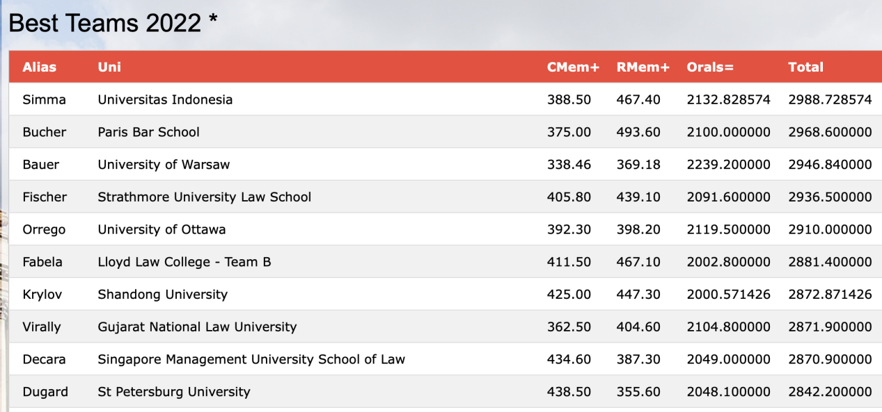 2022年8月,在经历了国内赛和亚太赛两轮比赛后,赛队以亚太四强的成绩晋级国际轮。在全球赛中,赛队成员完成了共计30000单词的法律书状,参加了五场庭辩,以严谨的法律论证和出色的庭辩表现赢得了仲裁员的赞赏,取得中国高校代表队积分最高成绩。