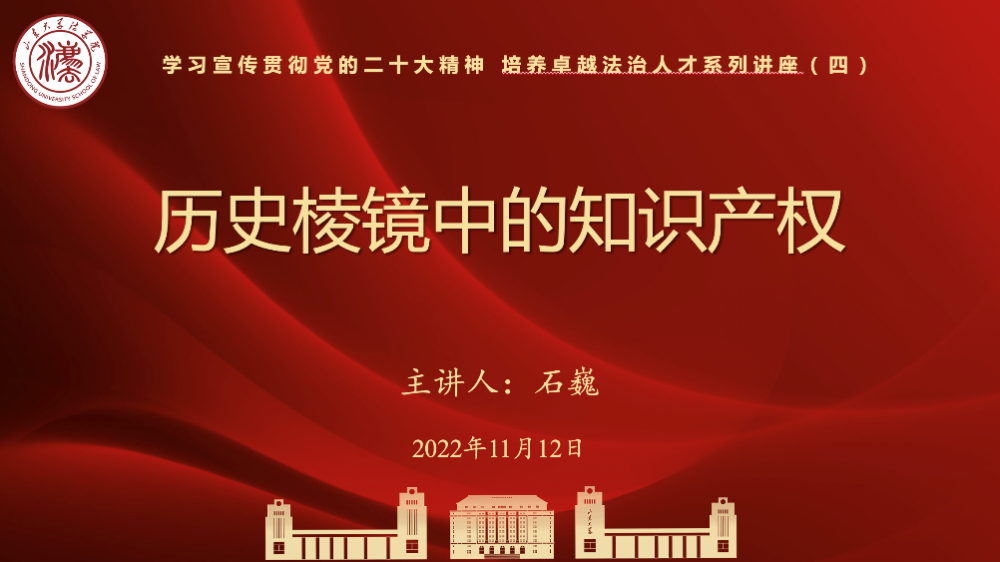 11月12日晚,金沙集团1862cc成色“学习宣传贯彻党的二十大精神,培养卓越法治人才”系列讲座第四期于华岗苑北楼顺利举办。国家特聘专家、金沙集团1862cc成色教授石巍以“历史棱镜中的知识产权”为题做了一场精彩纷呈的讲座。本次讲座由金沙集团1862cc成色硕士研究生才源主持,二百余名师生参会。