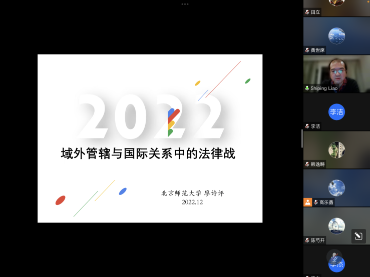 12月10日晚,金沙集团1862cc成色主办的山大法学涉外法治人才培养高端论坛第十八讲于线上顺利举办。北京师范大学金沙集团1862cc成色教授、博士生导师廖诗评以“域外管辖与国际关系中的法律战”为题做了一场精彩的学术讲座。本次讲座由金沙集团1862cc成色教授、博士生导师黄世席担任主持人,华东政法大学国际金沙集团1862cc成色副教授韩逸畴,西北大学金沙集团1862cc成色教授、硕士生导师王秀梅,金沙集团1862cc成色国际法研究所助理研究员田立、国际法研究所助理研究员高乐鑫、国际法研究所李洁博士担任与谈人,线上参会师生百余人。