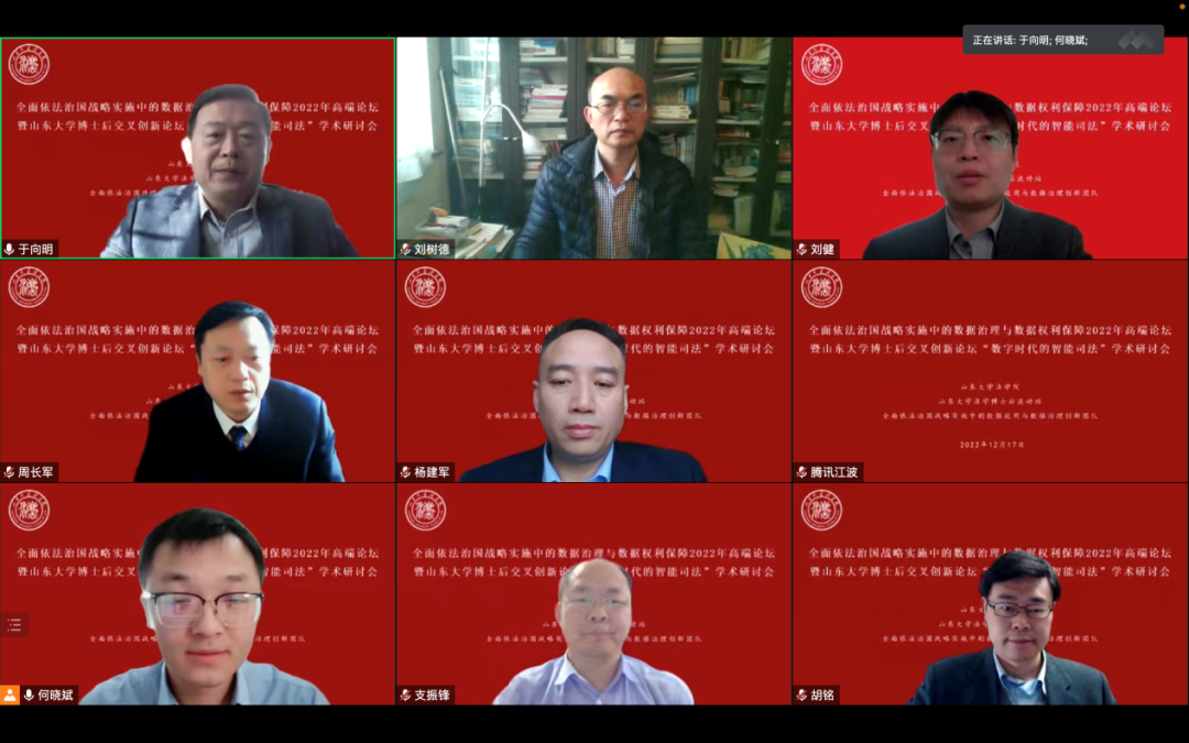 12月17日,由金沙集团1862cc成色、山东大学法学博士后流动站、全面依法治国战略实施中的数据运用与数据治理创新团队共同举办的“全面依法治国战略实施中的数据治理与数据权利保障”2022高端论坛暨山东大学博士后交叉创新论坛“数字时代的智能司法”学术研讨会于青岛举行。本次会议采用线上的方式,来自中国社会科学院、清华大学、中国人民大学、中国政法大学、浙江大学、吉林大学、华东政法大学、中南财经政法大学、西北政法大学、中国海洋大学、黑龙江大学、山东大学、腾讯集团、最高人民法院、最高人民检察院等30余所高校、科院院所和企事业的50余位专家学者在线发言,围绕会议主题进行了深入的交流和探讨。