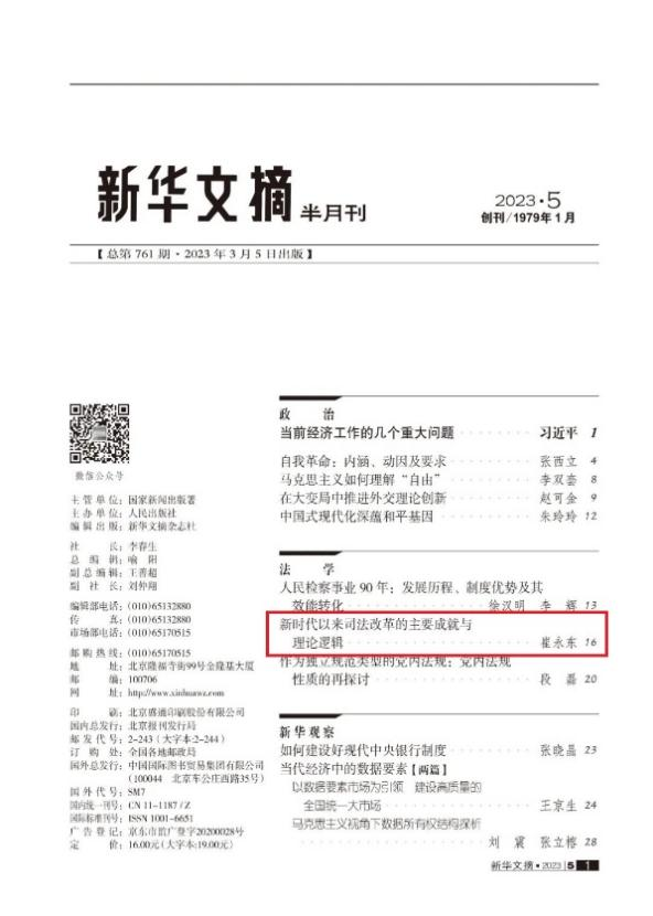 近日,崔永东教授发表于《政治与法律》2022年第12期的文章《新时代以来司法改革的主要成就与理论逻辑》被《新华文摘》2023年第5期全文转载。