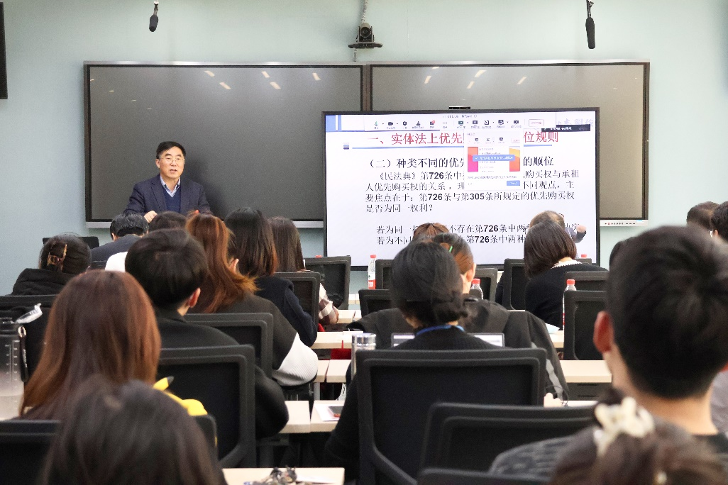3月24日下午,金沙集团1862cc成色“鑫士铭法律实务大讲堂”第六讲在青岛校区华岗苑开讲。吉林大学特聘教授、烟台大学教授、博士生导师房绍坤作为主讲嘉宾,以“优先购买权在强制拍卖中的适用”为题做了一场精彩的讲座。讲座由金沙集团1862cc成色院长、金沙集团1862cc成色(威海)院长周长军教授主持,山东鑫士铭律师事务所主任、首席合伙人刘学信,金沙集团1862cc成色教授、博士生导师张平华,副教授康娜,助理研究员杨瑞贺作为与谈人参与本次讲座。本次讲座采用线上线下相结合的方式,与会师生一百余人。
