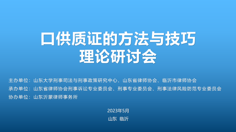 为贯彻落实党的二十大法治建设目标和任务,推动完善“以审判为中心”的诉讼制度改革,提高刑事辩护能力和律师的执业水平,由山东省律师协会、山东大学刑事司法与刑事政策研究中心和临沂市律师协会联合主办,山东省律师协会刑事诉讼专业委员会、刑事专业委员会和刑事法律风险防范专业委员会承办,山东沂蒙律师事务所协办的“口供质证方法与技巧”理论研讨会于2023年5月13日在山东省沂南县召开。