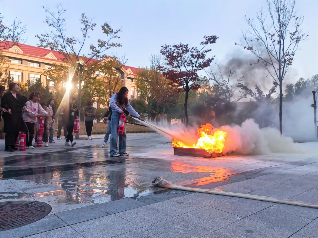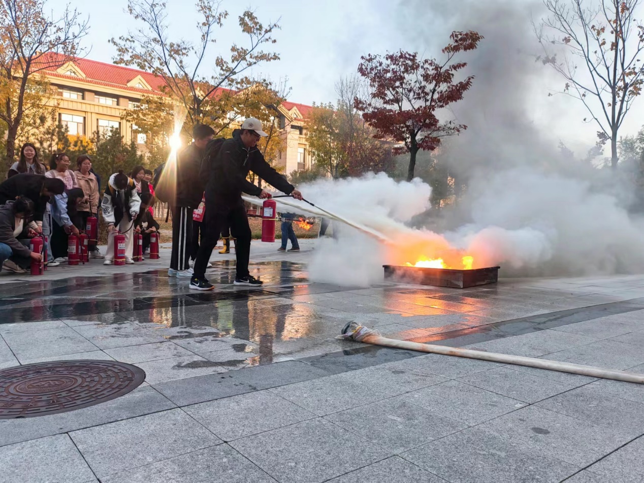 在模拟火灾现场的应急演练环节,学生们在保卫部老师们的具体指导下,分批次轮流体验了使用灭火器灭火的实际操作,有效掌握了灭火器材的使用方法。