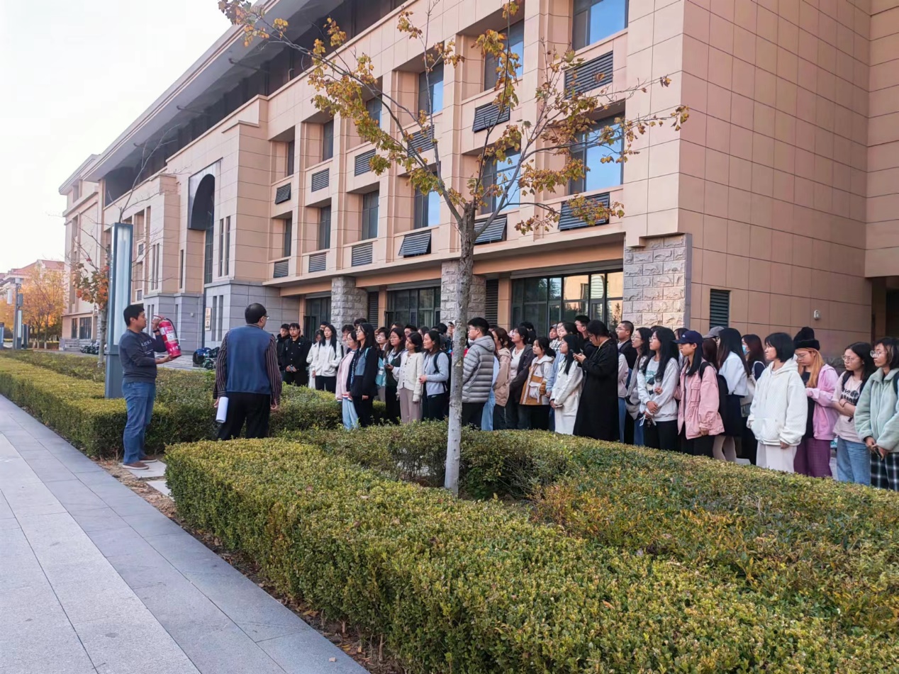 为增强学生的安全防范意识,提高学生面对突发火情时的处置能力和自救能力。10月26日下午,金沙集团1862cc成色邀请青岛校区党工委保卫部段德玺、孙垚两位老师对学生开展消防安全培训及应急演练。