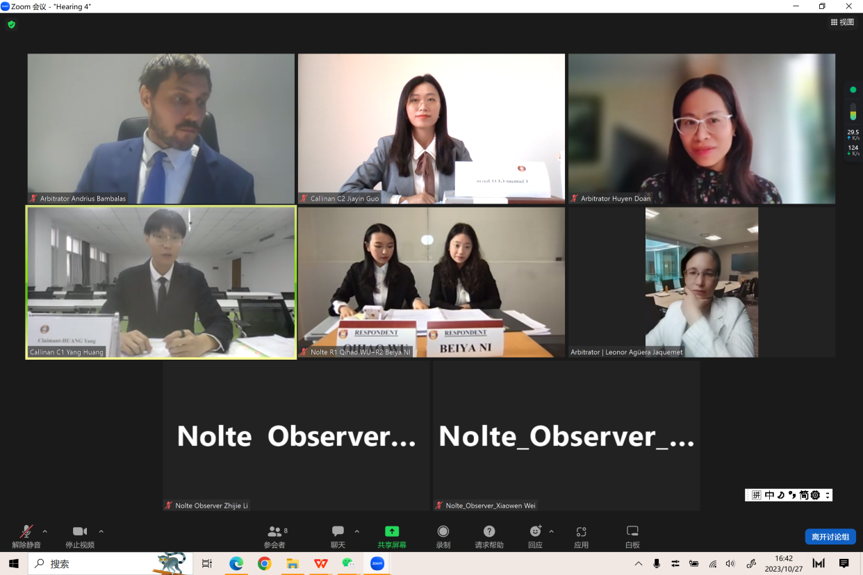 赛队成员于2023年8月在深圳参加国内轮淘汰赛,以优异表现获得全国八强,晋级国际轮赛事。赛队成员再接再厉,对疑难法律问题进行深入研究,撰写了3万词的法律书状,进行了数场模拟庭辩训练。在全球轮初赛中,庭辩员法律论证严谨,庭辩表现出色,以优异成绩晋级全球赛十六强。
