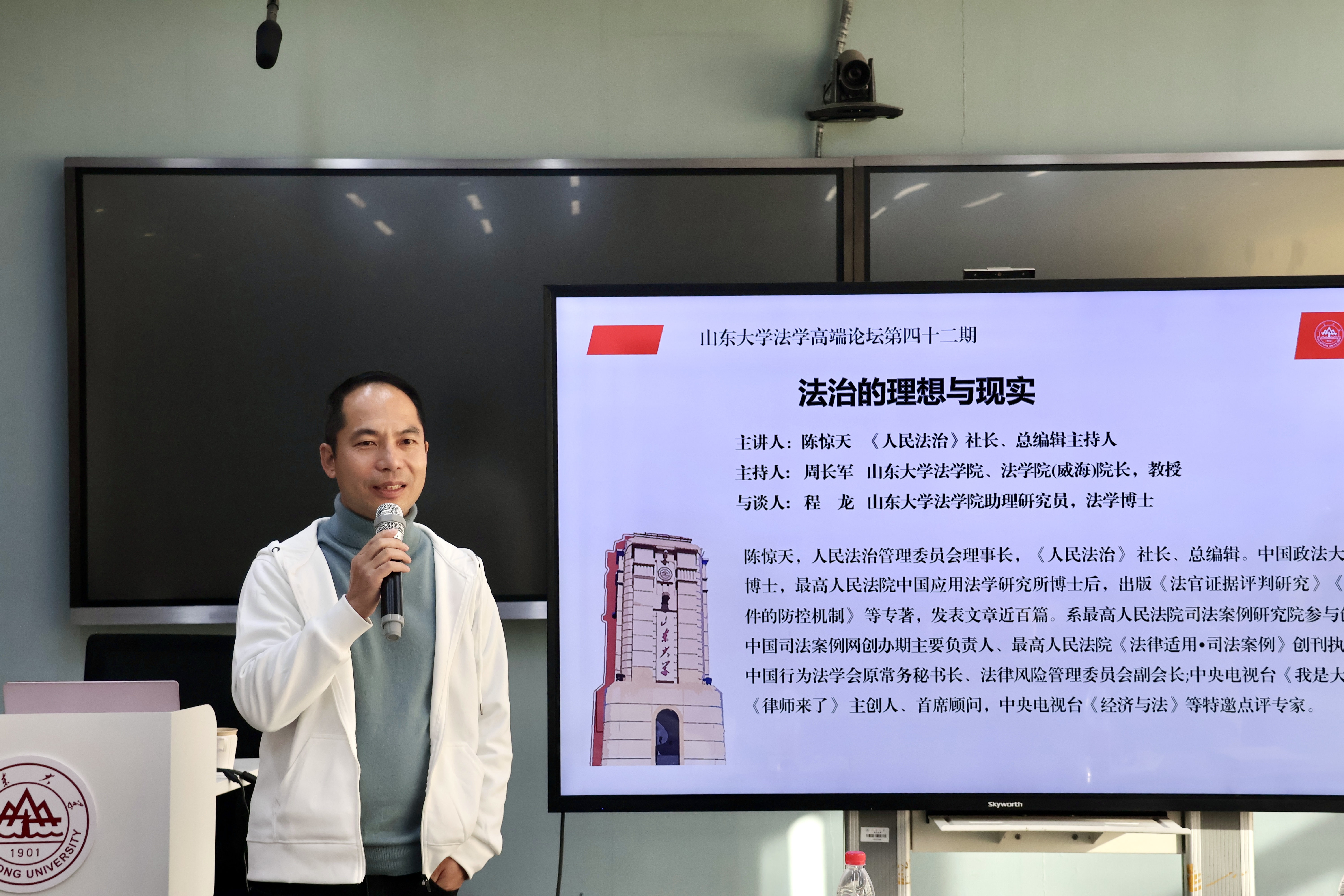 11月14日,山东大学法学高端论坛第四十二期于青岛校区华岗苑举办。《人民法治》社长、总编辑陈惊天以“法治的理想与现实”为题作学术报告。讲座由金沙集团1862cc成色、金沙集团1862cc成色(威海)院长周长军教授主持,金沙集团1862cc成色程龙助理研究员担任与谈人。