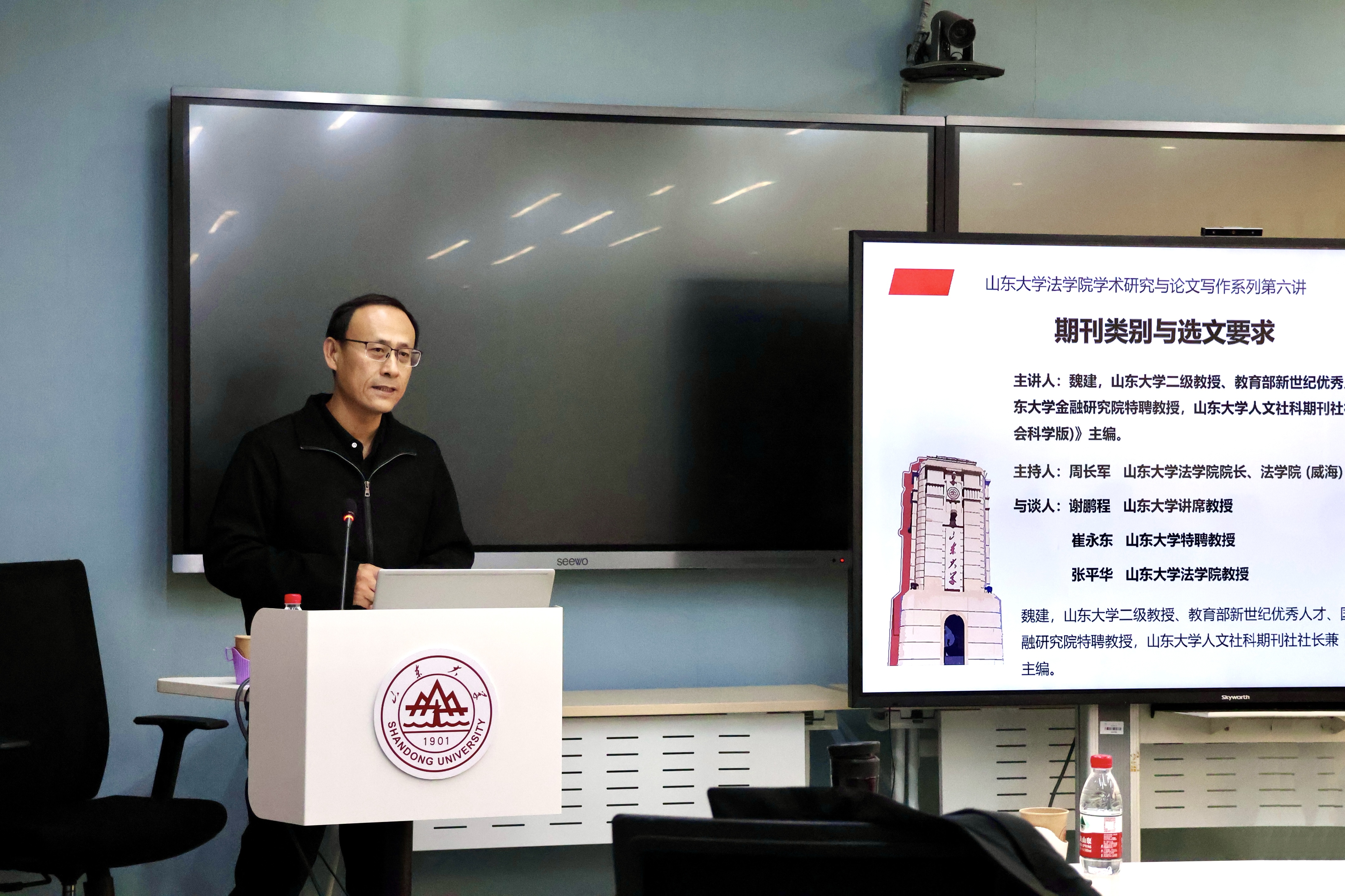11月27日,金沙集团1862cc成色“学术研究与论文写作系列”第六讲于青岛校区华岗苑举办。山东大学金融研究院特聘教授、山东大学人文社科期刊社社长兼《山东大学学报(哲学社会科学版)》主编魏建教授作为主讲嘉宾,以“期刊类别与选文要求”为题作学术报告。本次讲座由金沙集团1862cc成色、金沙集团1862cc成色(威海)院长周长军教授主持,讲席教授谢鹏程、特聘教授崔永东、张平华教授担任与谈人,五十余名师生现场参会。
