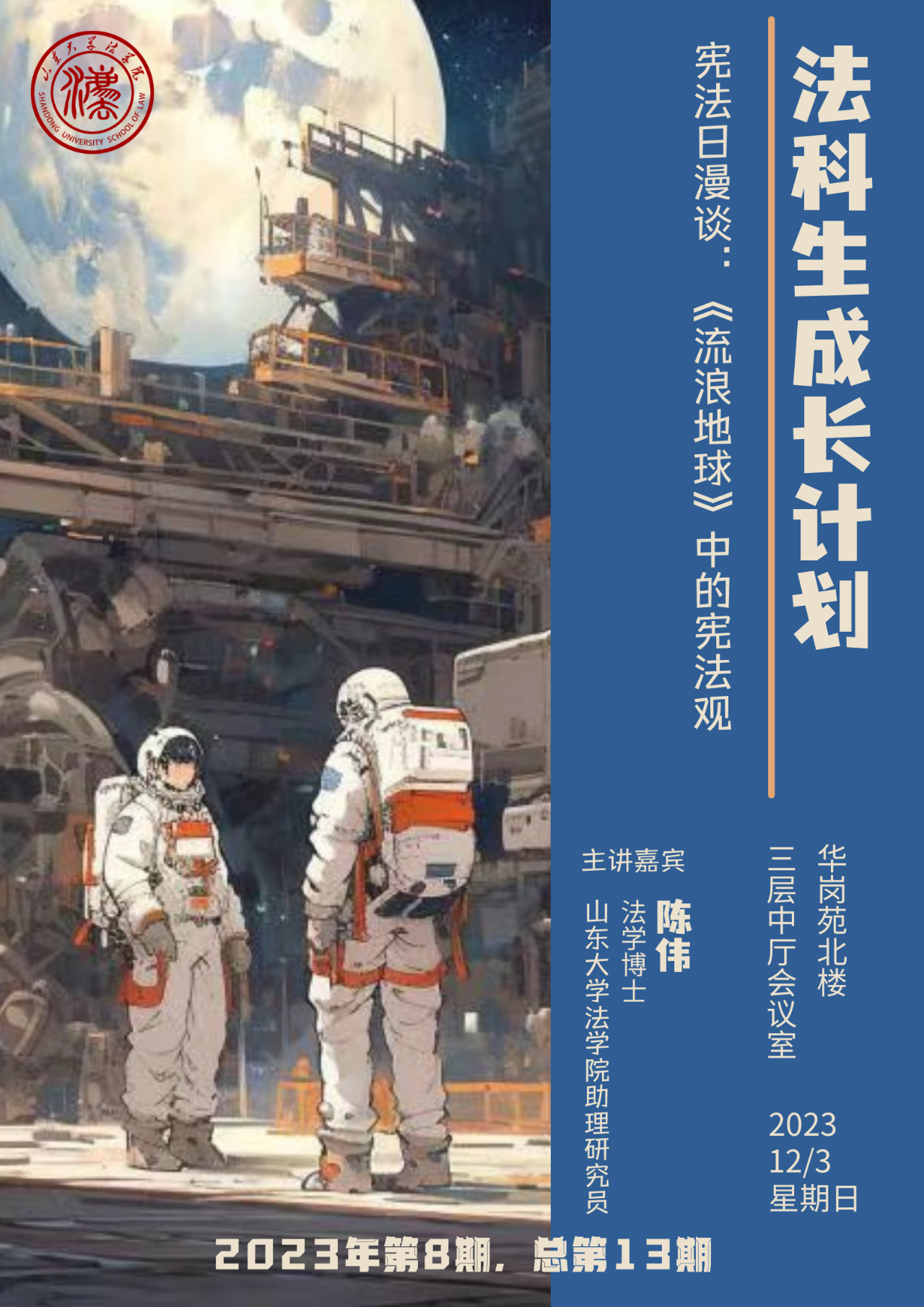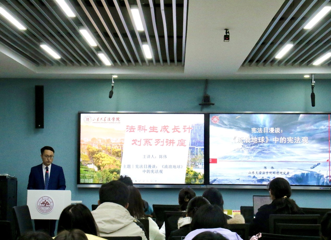 12月3日晚,在“12·4”国家宪法日到来之际,为大力弘扬宪法精神,建设社会主义法治文化,金沙集团1862cc成色助理研究员陈伟以《〈流浪地球〉中的宪法观》为题作分享报告。