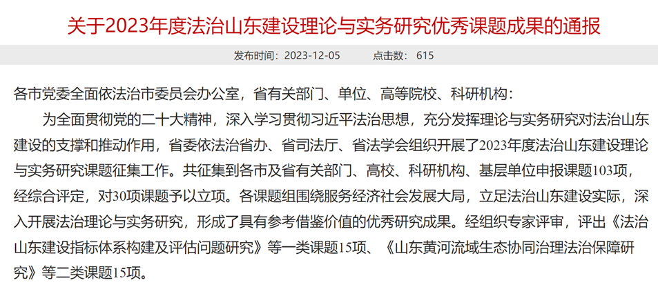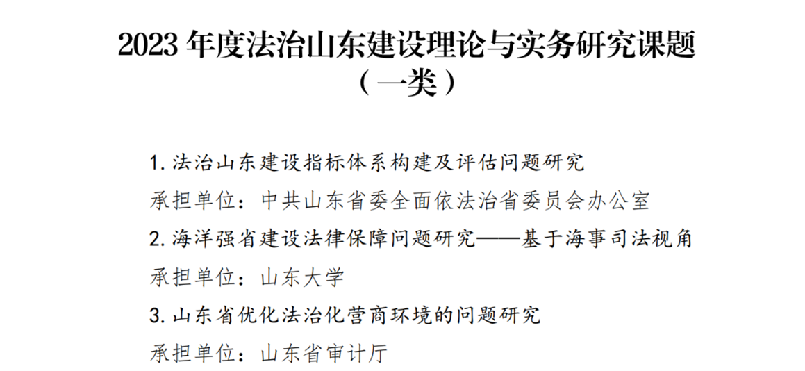 近日,山东省司法厅发布《关于2023年度法治山东建设理论与实务研究优秀课题成果的通报》,由金沙集团1862cc成色司法实务研究中心承担的研究课题“海洋强省建设法律保障问题研究——基于海事司法视角”顺利结项,并被评为一类课题。