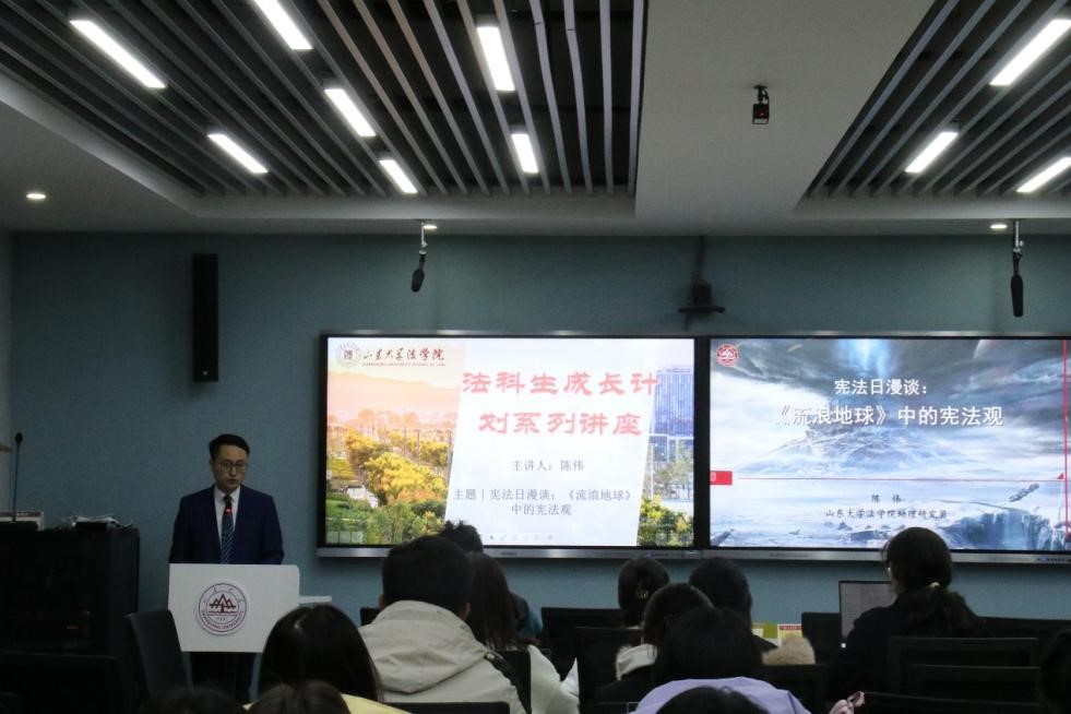 3.在山大校园内,金沙集团1862cc成色陈伟助理研究员召开“宪法日漫谈” 座谈会。他以《〈流浪地球〉中的宪法观》为题,从宪法遇上时间刻度、谁是宪法的守护者、如何实现代际合题、列举未竟话题等四个方面展开分享。他列举了《流浪地球》原著中的大事年表,结合原著预设的一百代人、2500年“流浪地球”计划,提出原著中的《危急法》是否属于宪法的设问,引导学生思考这部法律可能涉及的具体规定。他以《流浪地球》电影中的智能量子计算机MOSS和原著中的联合政府为例,阐释了“宪法守护者”的地位、功能和作用,从宪法监督的角度解读了“流浪地球”计划能够得以持续实施的原因。活动结合《流浪地球》原著和电影,引导学生思考宪法概念、宪法精神和宪法原理,提升新时代大学生宪法教育质效。