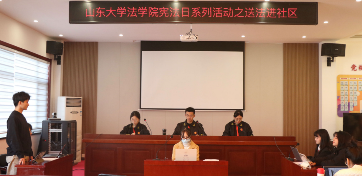 山东大学学生法律援助中心赴北宅社区开展普法活动,以模拟法庭情景剧的形式向社区居民进行普法宣传。情景剧由志愿者扮演审判长、书记员、诉讼代理人、原告、被告等角色,还原双方当事人在法庭上举证、质证、辩论的全过程,生动演绎生活中常见的法律问题以及案件诉讼的法律程序。活动以通俗易懂的方式代替单一的法治宣讲,通过“沉浸式”体验让群众认识到宪法法律与生活息息相关,加深对宪法和法律知识的理解感受法律的神圣与庄严,增强尊法学法守法用法的法治意识。