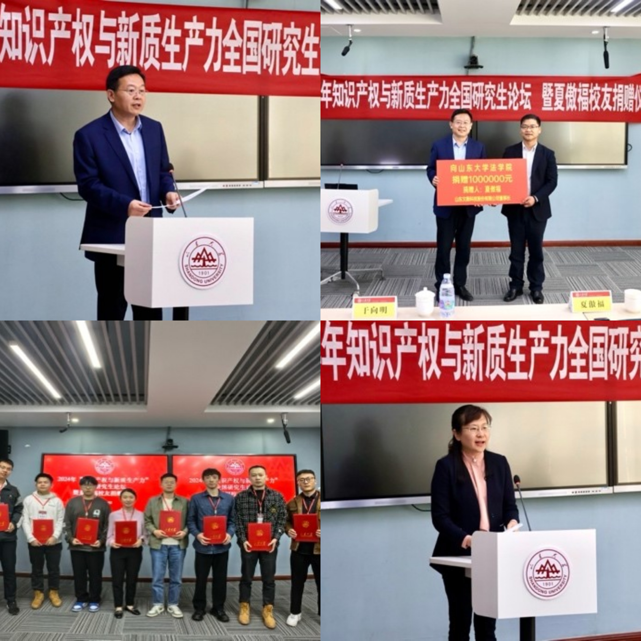 4月24日,值第24个“世界知识产权日”来临之际,由金沙集团1862cc成色主办的2024年“知识产权与新质生产力”全国研究生论坛暨夏傲福校友捐赠仪式在山东大学青岛校区举办。论坛共收到来自全国61所高校的114份稿件,经专家评审,评出特等奖1篇、一等奖2篇、二等奖3篇、三等奖4篇。来自北京大学、清华大学、浙江大学、武汉大学、上海交通大学、同济大学、中国政法大学、中南财经政法大学以及青岛市中级人民法院等10余所高校和法律实务部门的近30位专家学者和学生代表参会交流。