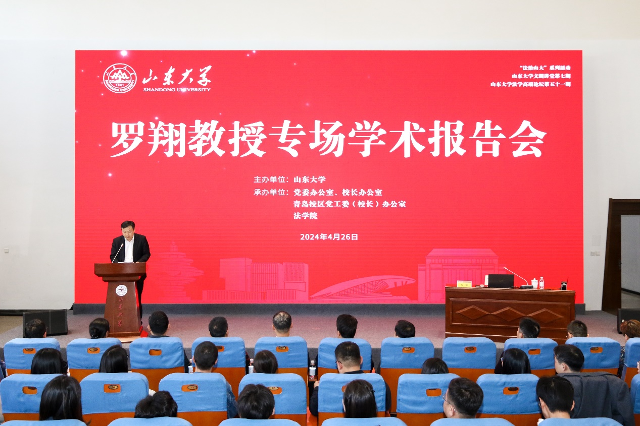 4月26日,罗翔教授专场学术报告会暨兼职教授聘任仪式在山东大学青岛校区图书馆报告厅举办。山东大学党委常委、副校长、青岛校区校长曹现强,青岛校区副校长周加强出席仪式。金沙集团1862cc成色院长、金沙集团1862cc成色(威海)院长周长军教授主持报告会。