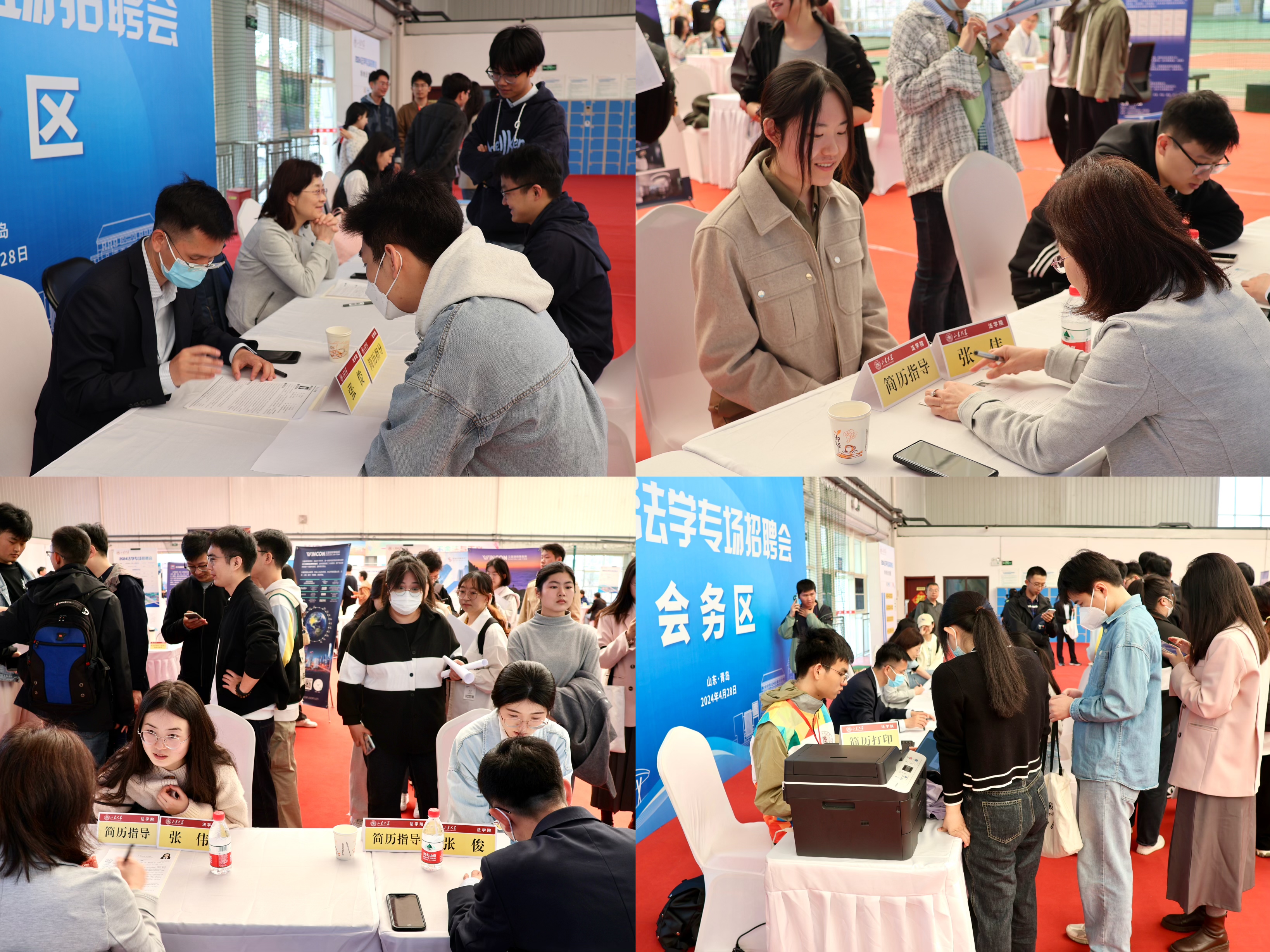 4月28日,2024山东大学法学专场招聘会在青岛校区风雨操场举办。校区学生工作部部长刘琰、副部长李娟到场指导交流,学院正处级辅导员齐向东,党委副书记董雪梅、宋继斌参加招聘会。