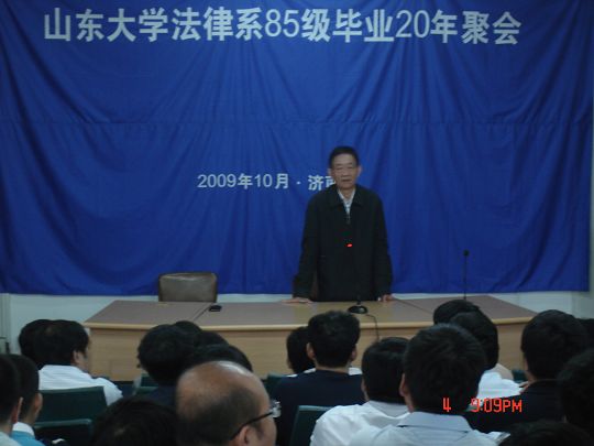 历经二十年的锤炼,当年的法律学子如今已成长为政法机关、律师行业、高等教育或企事业单位的骨干精英。上午8时,校友们在当年曾读书学习的法学楼101教室举行了毕业20周年聚会典礼。聚会伊始,适逢徐显明校长到金沙集团1862cc成色视察工作,受到昔日学子们的热烈欢迎。徐显明即席发表了富有深意的讲话。徐显明欢迎各位校友重回母校,并感谢校友们多年来对山东大学与金沙集团1862cc成色发展的关注和参与。他与各位校友共同回忆了山东大学以及金沙集团1862cc成色的发展与变化,列举了学校在办学规模、学科门类、学术影响方面所取得的可喜成绩;他还着重阐述了对于当代中国法学教育的看法,他指出:当代中国法学教育存在着四大矛盾,即法学教育的低起点与法律职业的高素质要求的矛盾,法学教育的大众化与精英化的矛盾,法学教育的通识化与职业化的矛盾,法学教育到底是人文教育还是科学教育或者是必须二者兼有的矛盾。除了这四大矛盾之外,徐校长还指出法学教育存在两个根本性的缺陷。第一、就是中国的法学教育当中缺乏司法伦理的训练;第二、就是中国法学教育当中缺乏职业技巧培训。而这四大问题、两大缺陷就是目前中国法学教育的基本现状,急需要加以改变。徐校长勉励大家,作为一名法律人,应当意识到人的终极目标在于人格的自我完善,学习与伦理的修养伴随人的一生,要做一个对社会、对母校有贡献的人。他鼓励大家积极为母校的发展建言献策、贡献自己应有的力量。徐校长当场为校友李良品、宫钊颁发了山东大学校友会理事聘书。聚会前,徐显明还与全体返校校友在新启用的法学新楼前合影留念。