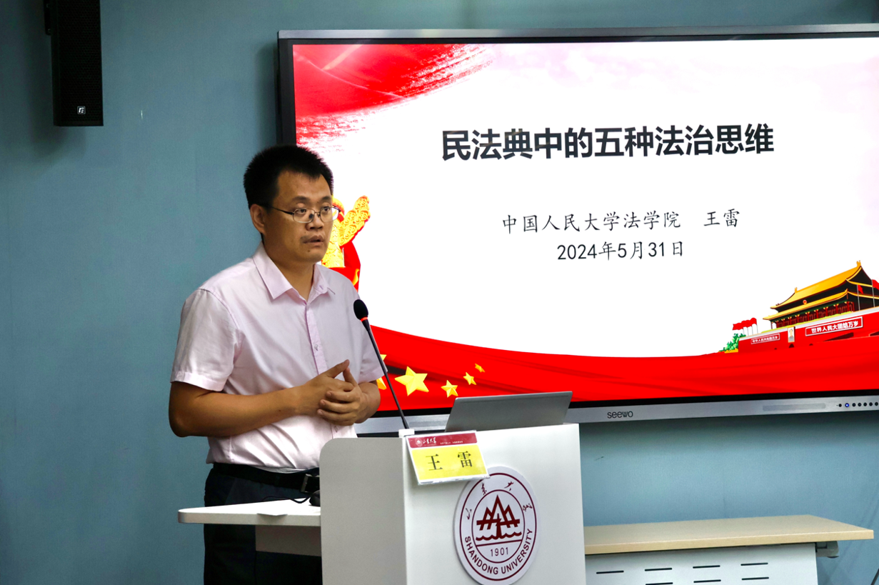 5月31日,山东大学“法学高端论坛”第六十三期于青岛校区华岗苑举办。中国人民大学金沙集团1862cc成色教授、博士生导师王雷以“民法典中的法治思维”为题作学术报告。讲座由金沙集团1862cc成色副研究员李若祺主持,金沙集团1862cc成色(威海)刘经靖教授,中国海洋大学金沙集团1862cc成色瞿灵敏副教授,金沙集团1862cc成色张平华教授、助理研究员杨瑞贺、助理研究员胡乃馨、博士后王玉乔担任与谈人。