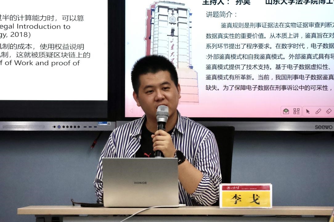 6月4日,“山东大学木青法学博士生论坛”第十期于青岛校区华岗苑举办。金沙集团1862cc成色博士研究生李戈以“数字时代刑事电子数据鉴真问题研究”为题作学术报告。论坛由金沙集团1862cc成色博士研究生孙昊主持,金沙集团1862cc成色副院长冯俊伟教授、助理研究员段君尚担任与谈人。