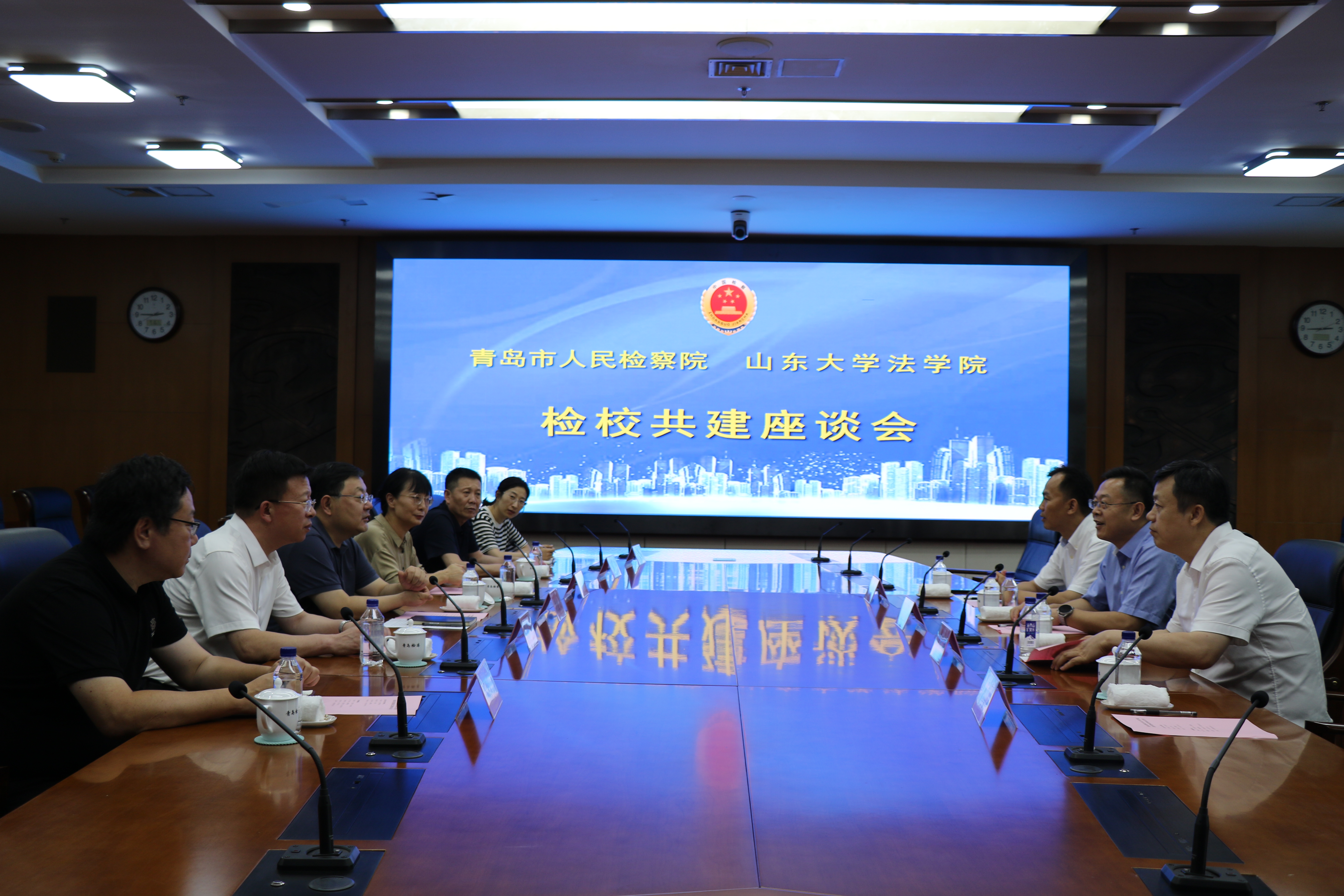 7月16日,金沙集团1862cc成色与青岛市人民检察院检校共建座谈会在青岛市人民检察院召开。青岛市人民检察院党组书记、检察长段连才,副检察长张薇,党组成员、政治部主任黄迪勇,办公室主任赵连杰,组织教育处处长王海声,金沙集团1862cc成色党委书记于向明,金沙集团1862cc成色院长、金沙集团1862cc成色(威海)院长周长军,副院长付本超,社会合作专员巩合吉出席会议。