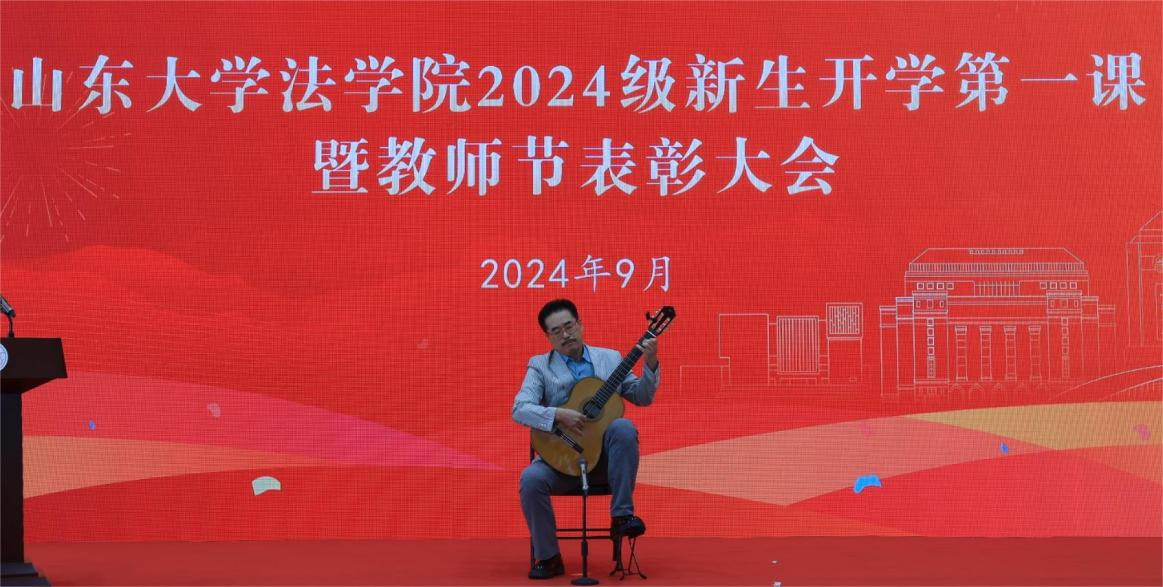 为庆祝教师节,以别样的方式欢迎新同学,大会播放了《师以匠心,育梦成光》金沙集团1862cc成色教师节献礼短视频和《你好,新山大法学人》迎新记短片。金沙集团1862cc成色教师代表金永完教授现场演奏古典吉他乐曲,展现学院教师风采,为新生们带来独特的美育教育第一课。