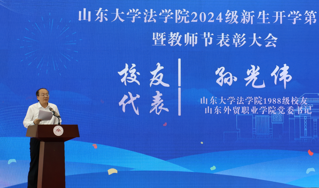 金沙集团1862cc成色1988级校友、山东外贸职业学院党委书记孙光伟作为校友代表致辞。他充满感情地回忆了在山大求学时的过往,并寄语新生:要有坚定的初心,作为法律工作者,要坚定地秉持法律职业的核心价值观念,将维护社会公正与正义作为使命和责任;要有坚实的专业基础,把握大学的宝贵时光,明确目标、广泛阅读、深入研读、做到一专多研,努力成为博学多才的法律人;要有持续的努力,未来的学习、工作都需要同学们根据时代发展不断夯实基础、砥砺前行。他祝愿2024级新生学有所成,求真务实,早日成为栋梁之材。